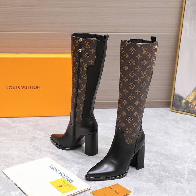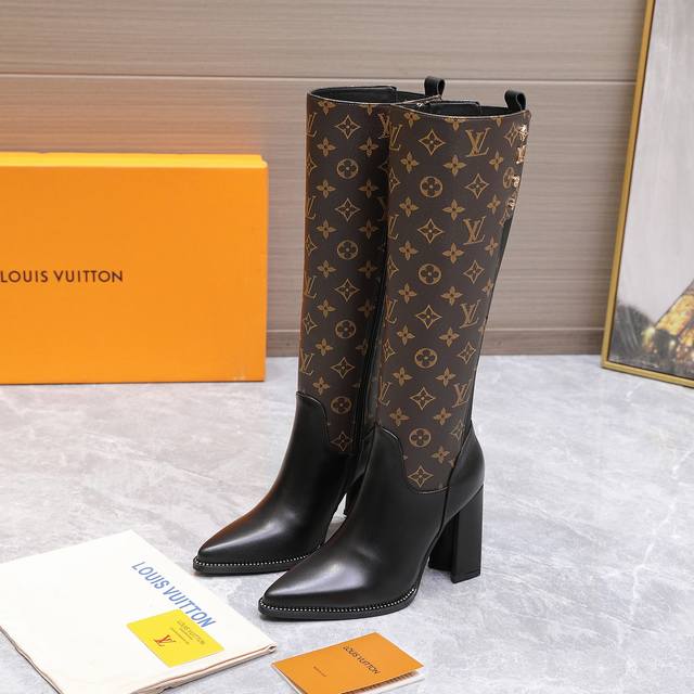 代购级!全配套包装 Loui& Vuitto& 本款Silhouette 小V跟尖头骑士靴,Lv新元素子母扣装饰、工艺复杂、V跟+大底边镶钻设计、尽显高贵气质、原版倒模楦型,侧拉链方便穿脱。 材料:进口顶级小牛皮 内里: 进口羊皮 垫脚:羊皮 大底:原版仿皮大底 跟高:9.5Cm 鞋码: 34-41 34.40.41定做不退换 价格P:短靴 长靴380