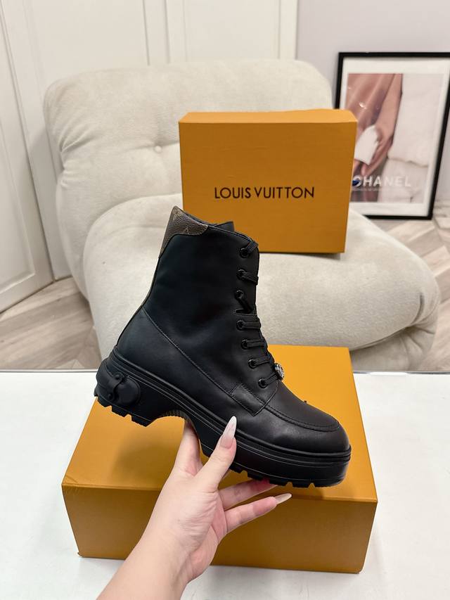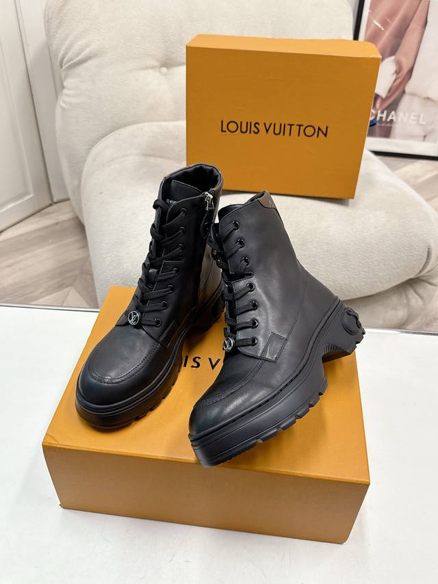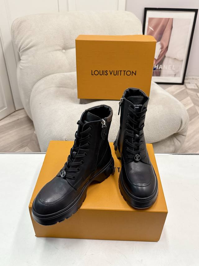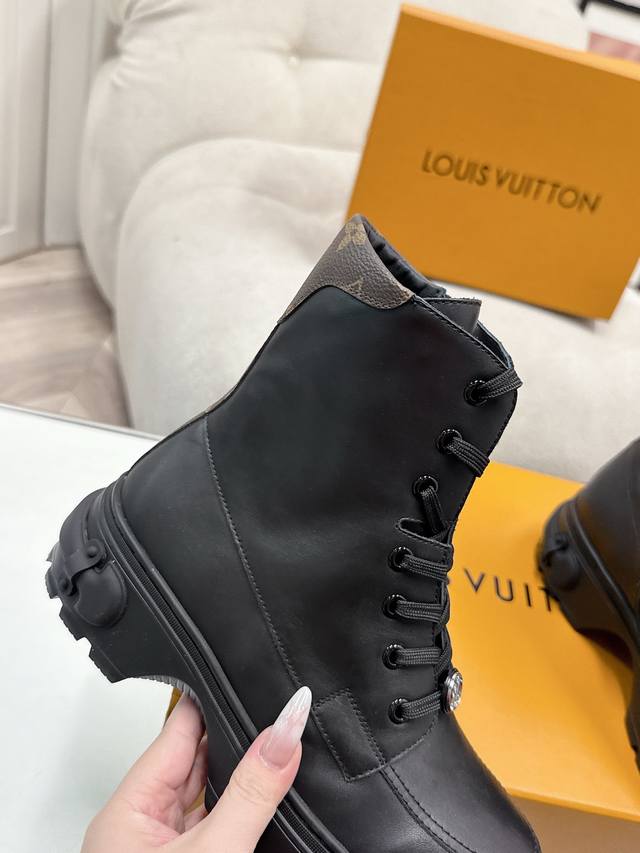 FFF 代购级 Size: 女35-41 女40 41 订做不退换 DDD Lv印花路易威登L家 驴牌秋冬短靴一脚蹬马丁靴 DDD 原版购入开发 做货 Lv Checker 及踝靴亮相于路易威登春夏秀场,以正绒面牛皮革演绎多元风尚。 DDD 点缀铭纹金属链条和 Vuitton 鞋带装饰,厚实而轻盈的橡胶外底援引工装鞋设计。鞋底凸纹 Damier 图案点睛细节 DDD 面料: 原版定制进口头层牛皮 内里:原版进口牛皮鞋底:原版开模防滑橡胶材质 DDD 底厚:4Cm DDD