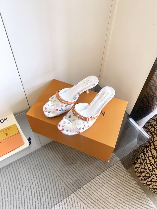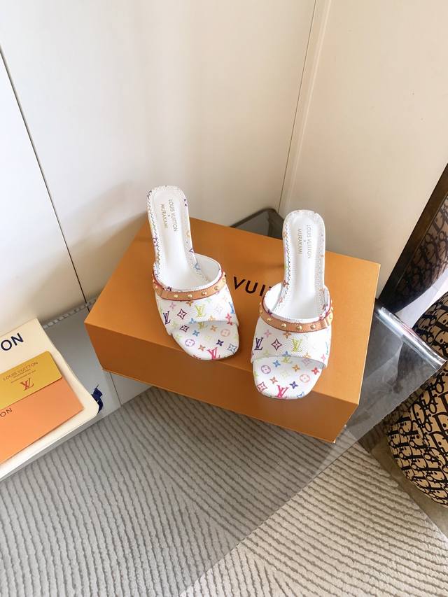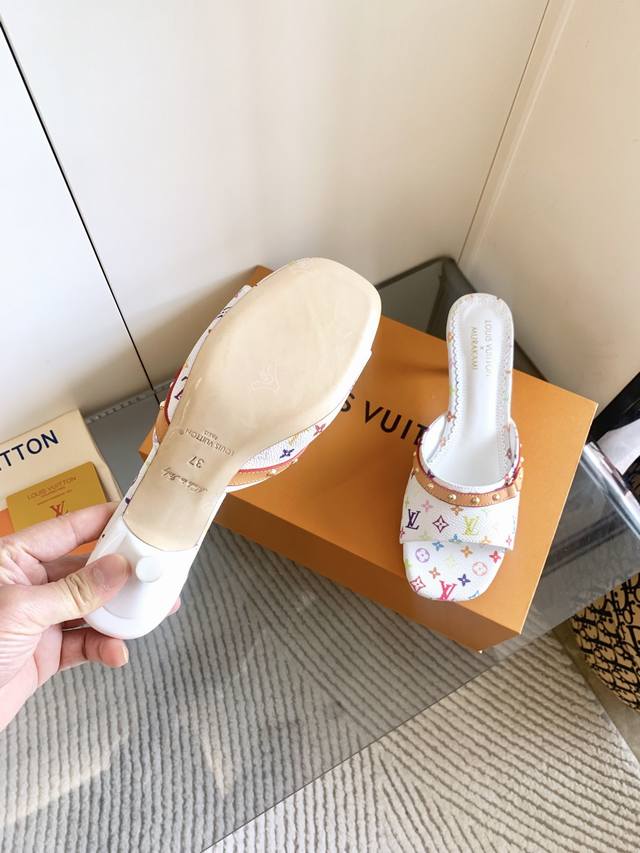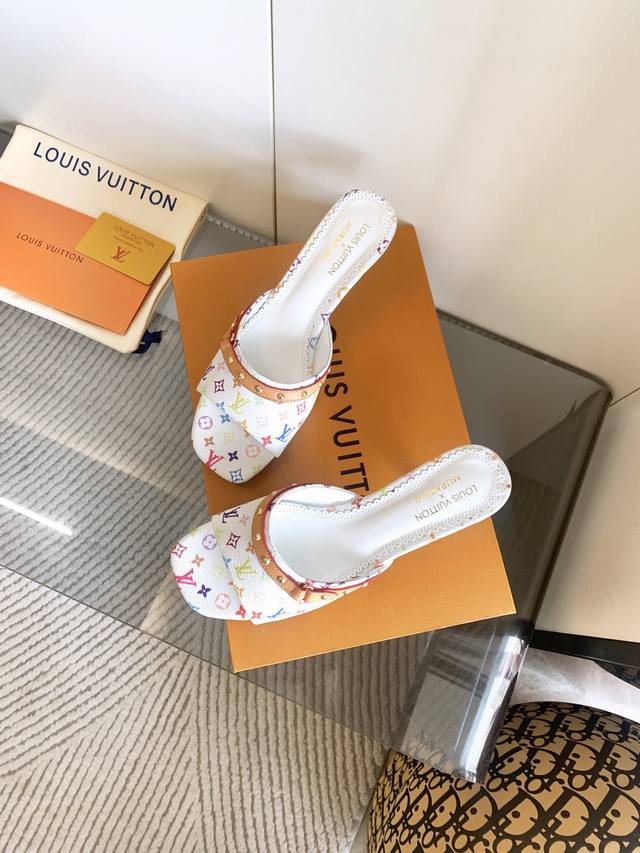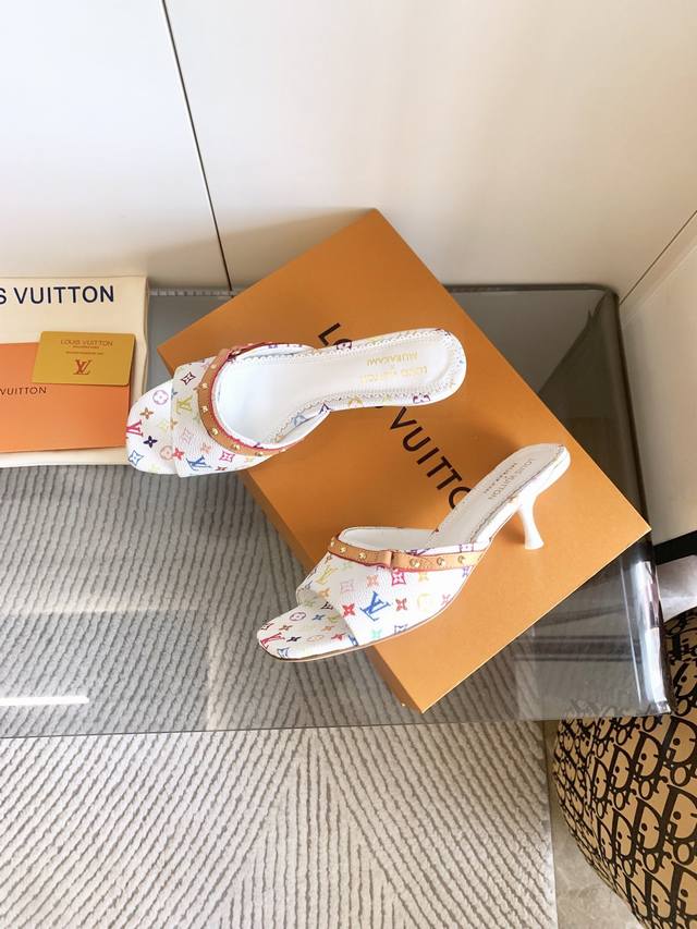 louis Vuitton 2025春夏新款猫跟蝴蝶结果冻色女鞋 Lv 字母Logo五金扣方头拼色凉拖鞋 材质...