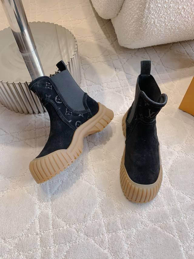 / 出厂价p Louis Vuitt*经典贝壳头短靴 鞋型酷酷的样子中带点俏皮可爱 很好搭配,脚感好!增高效果也不错呀! 鞋面牛皮 内里羊皮 原版开模大底 尺码35
