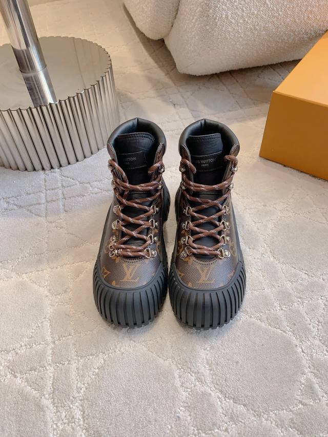 出厂价p Louis Vuitt*经典贝壳头短靴 鞋型酷酷的样子中带点俏皮可爱 很好搭配,脚感好!增高效果也不错呀! 鞋面牛皮 原版老花面料 内里羊皮 原版开模