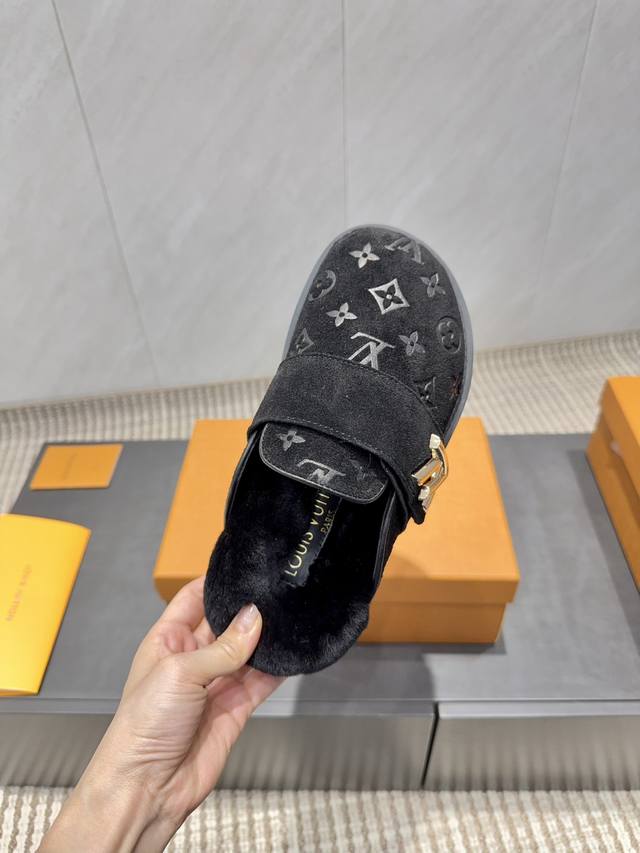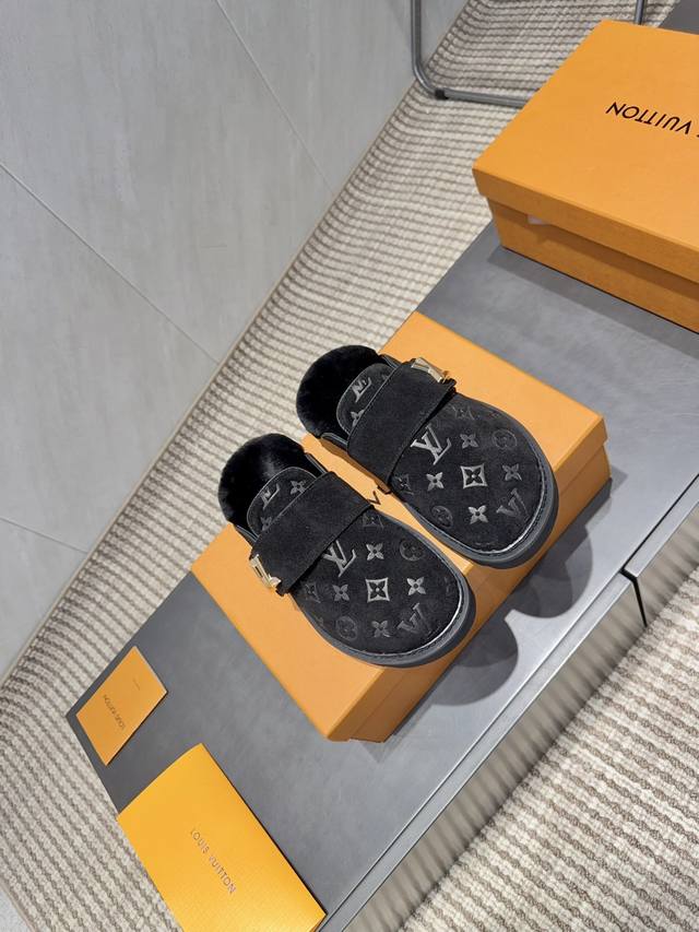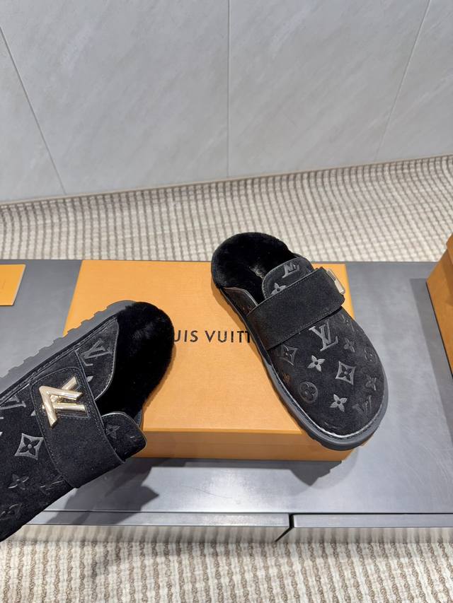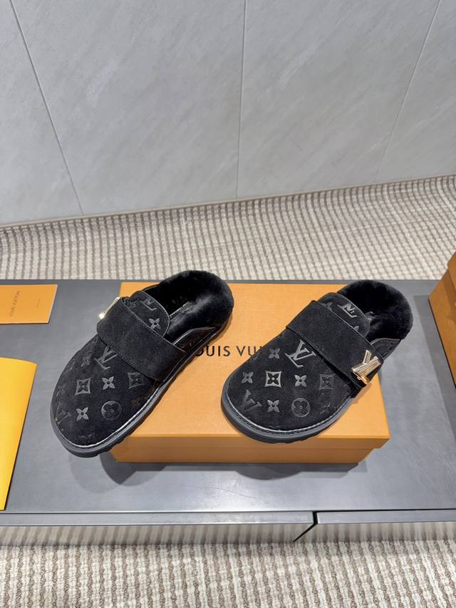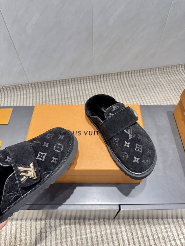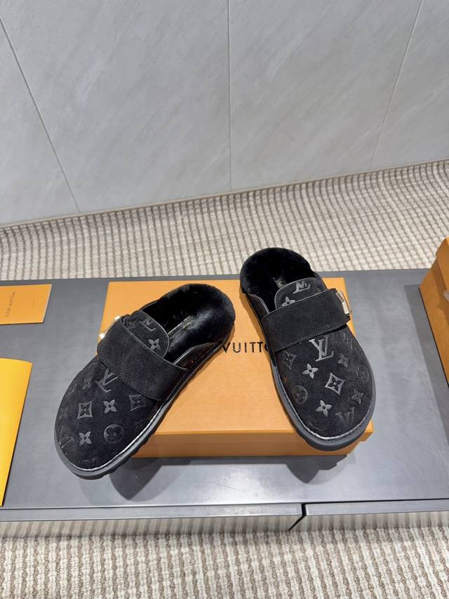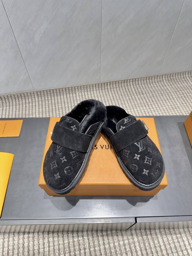 2025专柜新款毛毛半拖拖 Winterbreak Comfert 平底拖鞋 Lv 字母和Monogram 花卉点缀图案的皮面,搭配羊毛内里,室内外穿着皆宜。纯