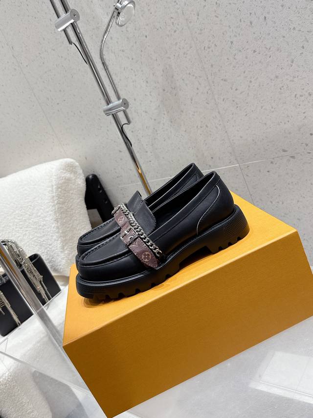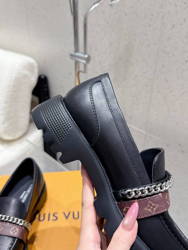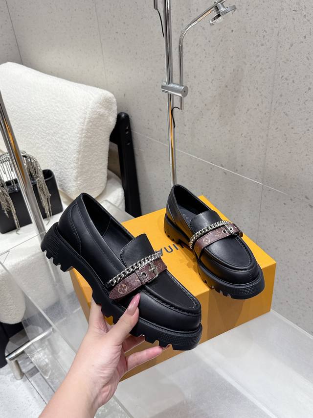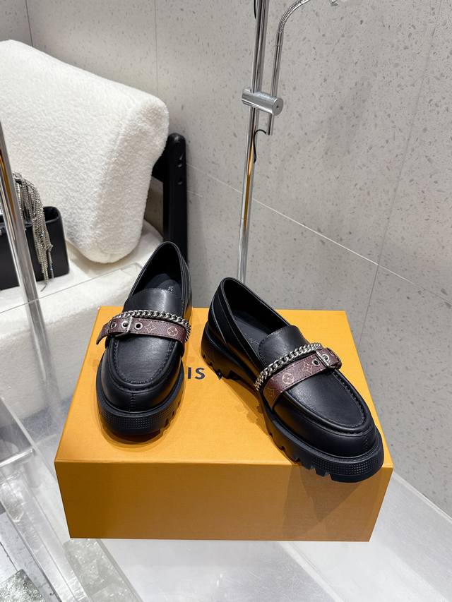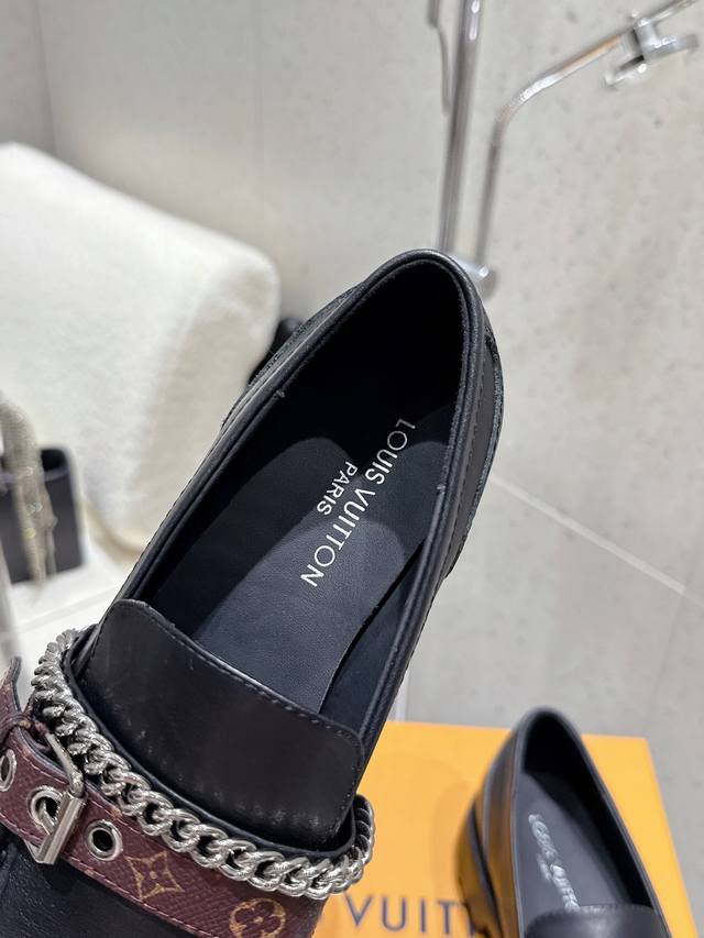 出厂 Louis Vuitton 25Ss秋冬新款 Lv 老花皮带链条厚底乐福鞋 单鞋 皮鞋 鞋面:牛皮 老花皮 内里垫脚:牛皮 鞋底:原版开模定制橡胶大底 码