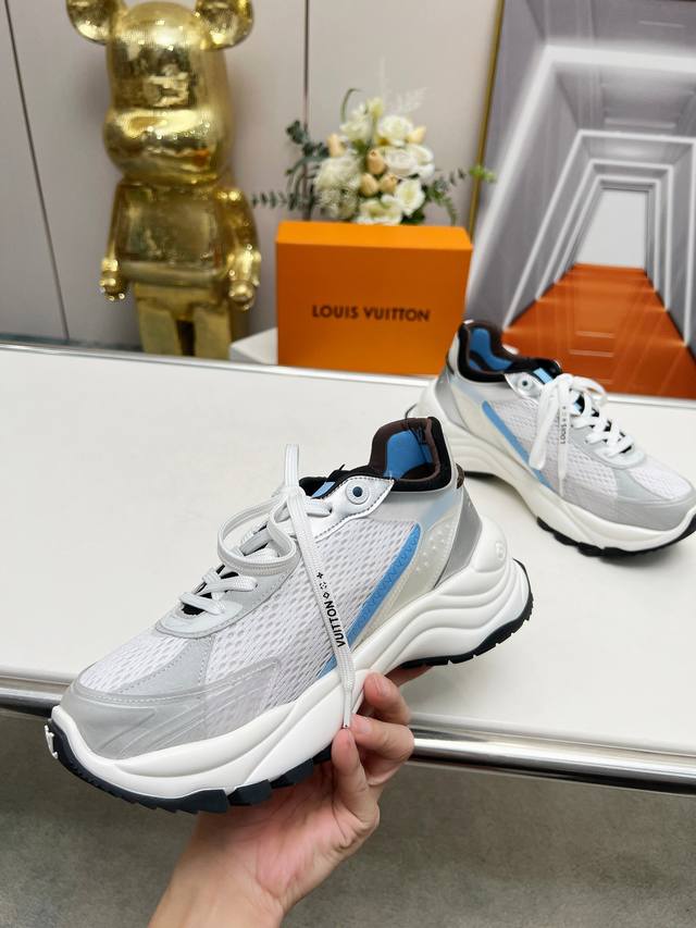 / 官网专柜1比1制作,Lv路易威登Run 55 运动鞋拼合网格面料、橡胶和粘胶等科技材质,搭配牛皮革材质,共同洋溢运动格调。Monogram 帆布后袢带等标志性元