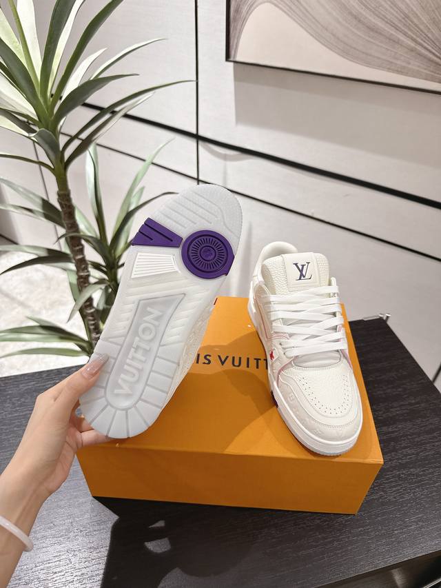 原版购入开发 路易威登 X Tyler 合作系列推出 Lv Trainer 运动鞋,延续 Virgil Abloh 基于复古篮球鞋创作的经典设计。牛皮革鞋面融入 Craggy Monogram 压纹和路易威登标识,展现 Tyler 对 Monogram 图案和品牌元素的趣味重构