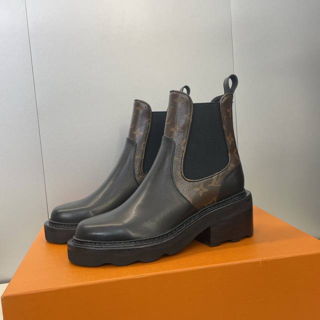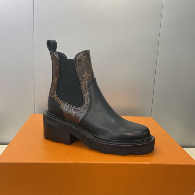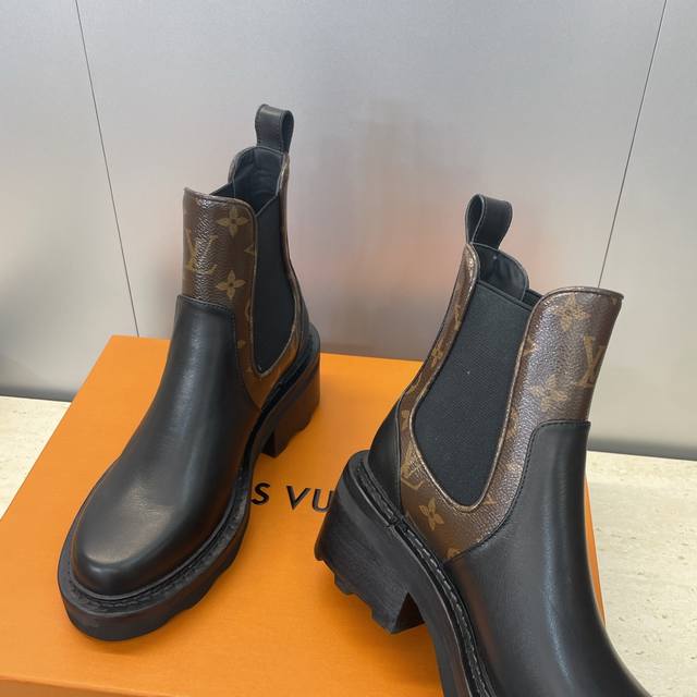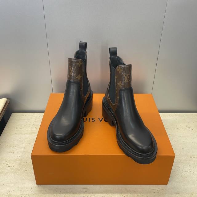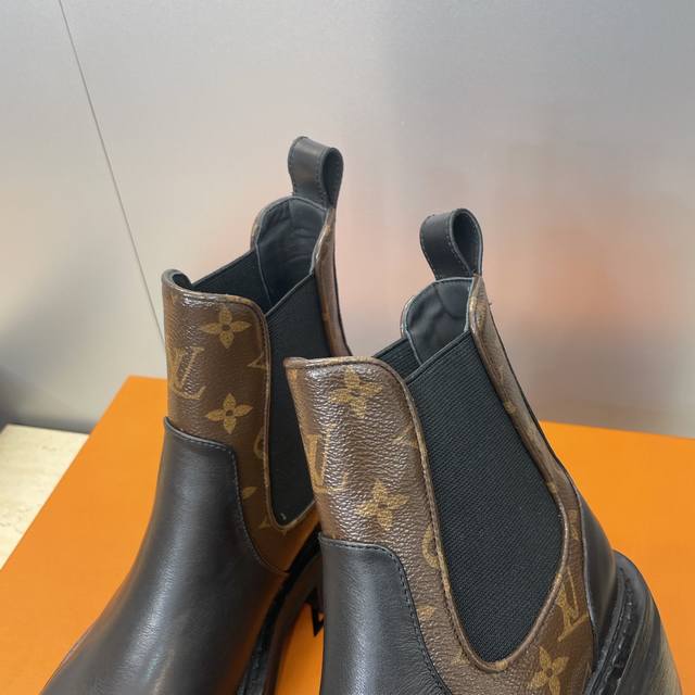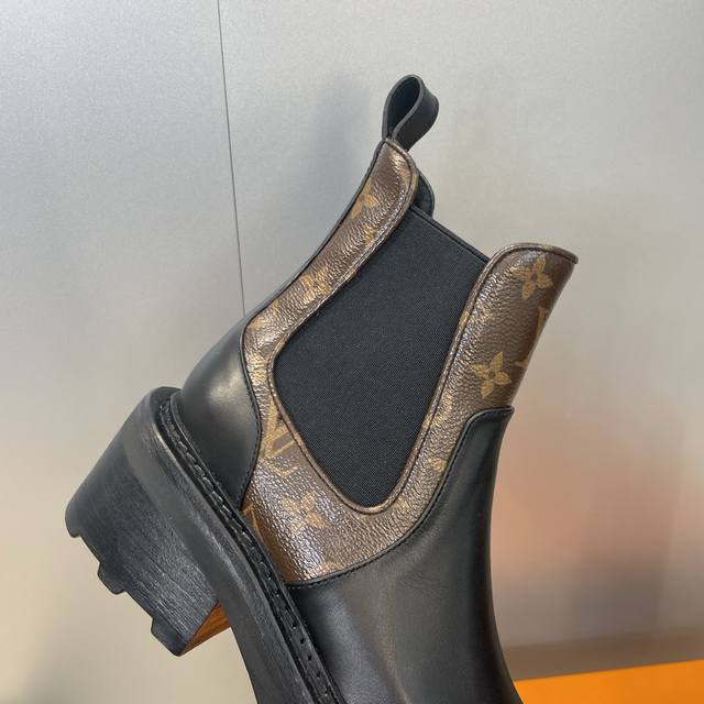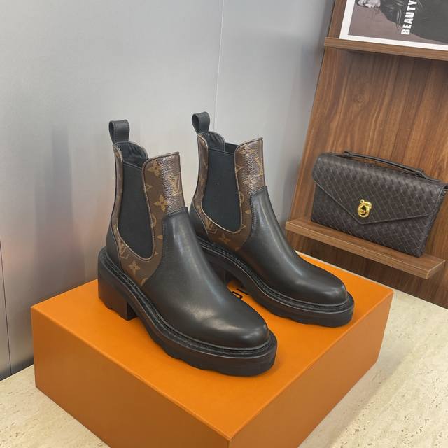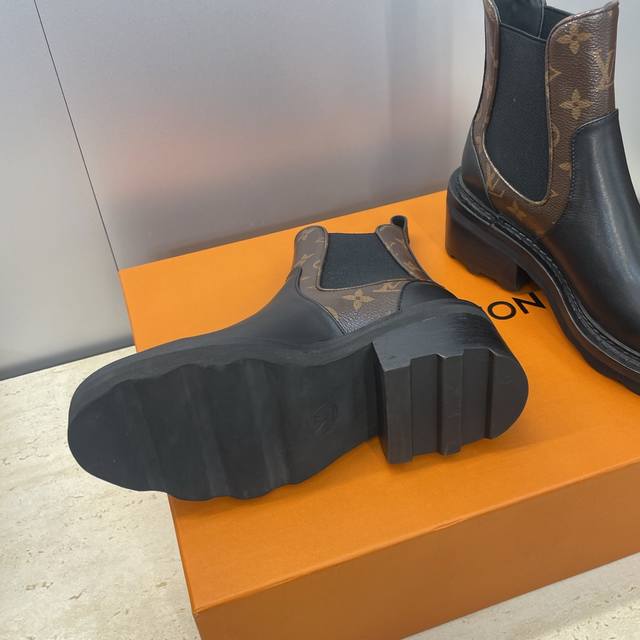 / 工厂p价p Louis Vuitton* 2025秋冬新款切尔西风格弹力机车短靴 Lv字母Logo五金扣厚底低跟拼色一脚蹬骑士靴 材质:鞋面进口小牛皮 进口老花