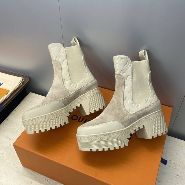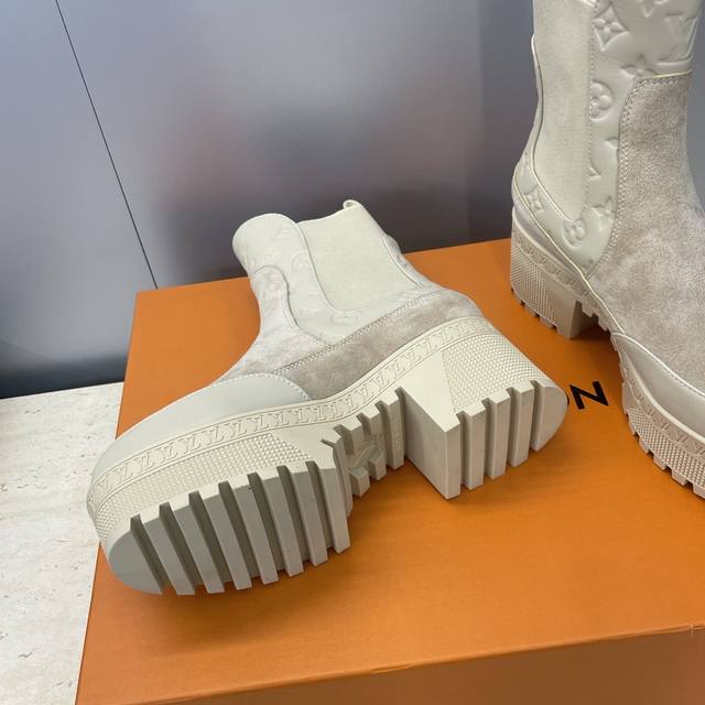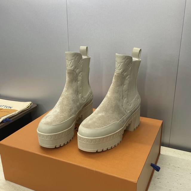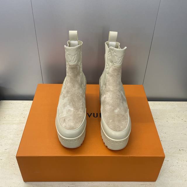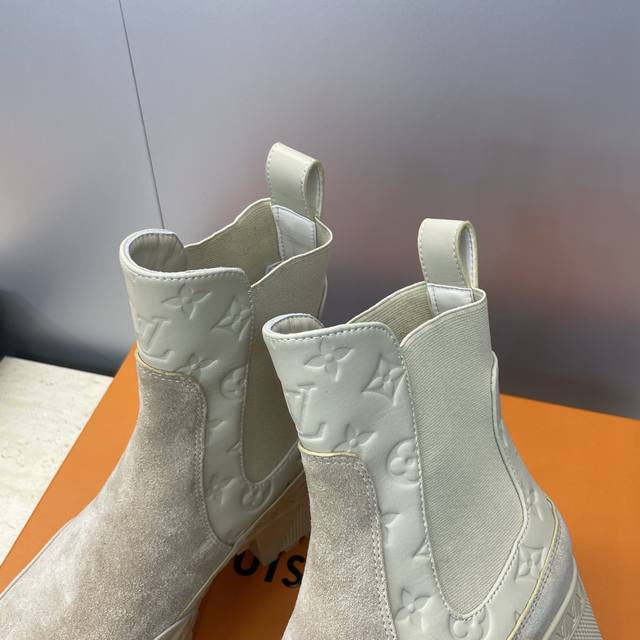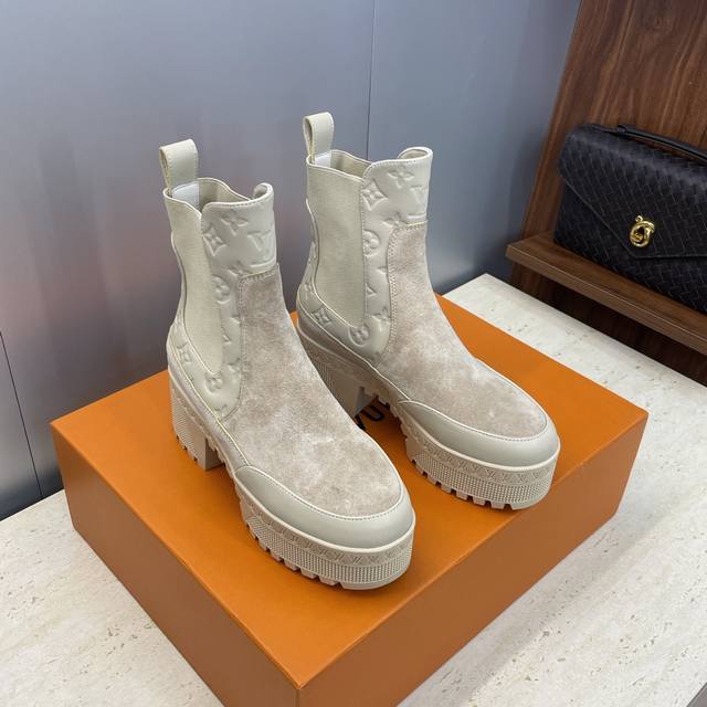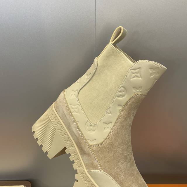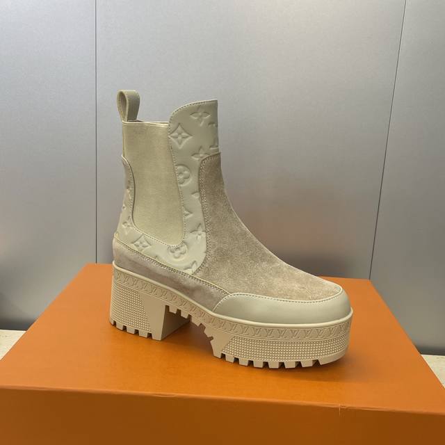 工厂p价p Louis Vuitton* 2025秋冬新款切尔西风格弹力机车短靴 Lv字母Logo厚底低跟防水台拼色一脚蹬骑士靴 材质:鞋面进口小牛皮 进口老花