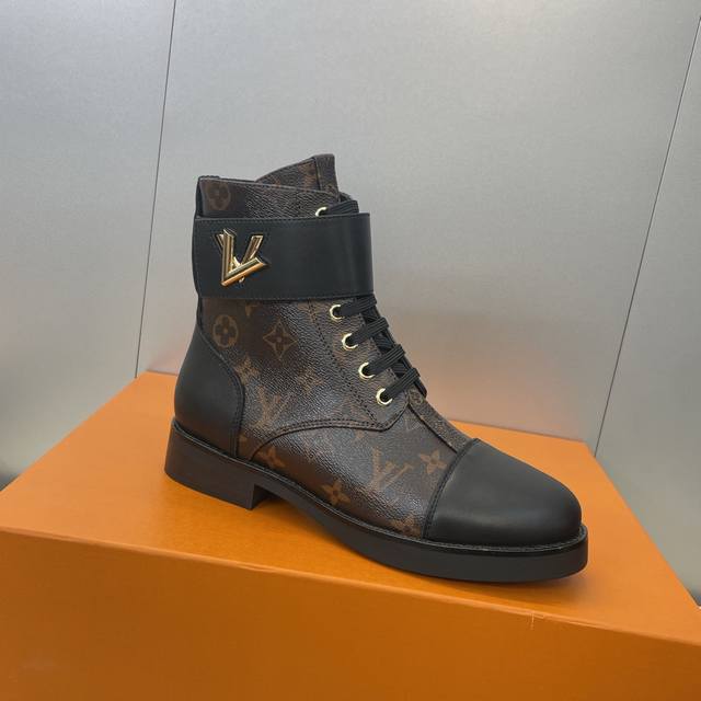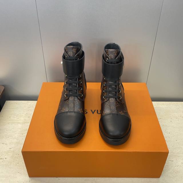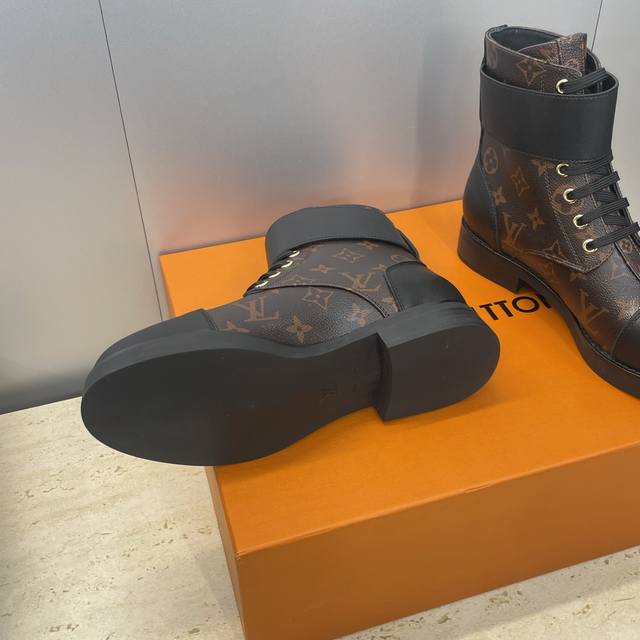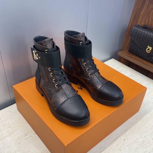 工厂p价p DDD Louis Vuitton* 2025秋冬新款朋克风格系带机车短靴 Lv字母Logo五金皮带扣低跟拼色骑士靴 DDD 材质:鞋面进口开边珠牛皮 进口老花皮+水染牛皮内里+原版开模大底 DDD Size:女码35-42 42定制不退换 DDD