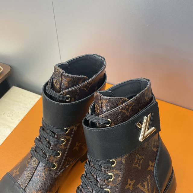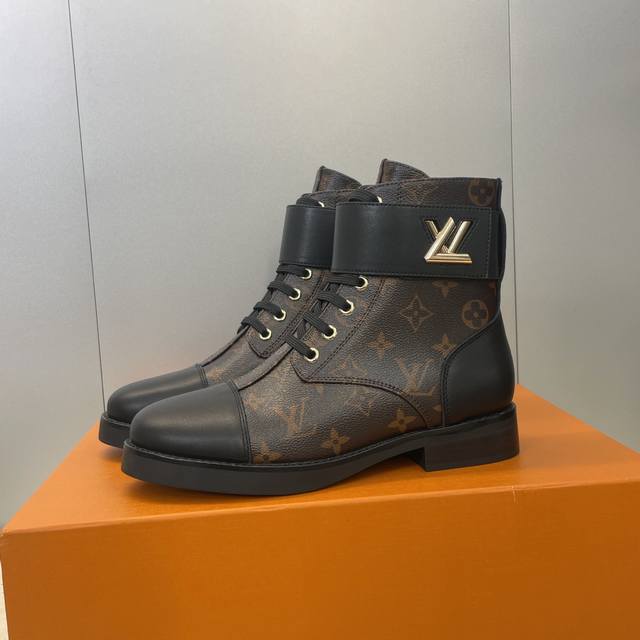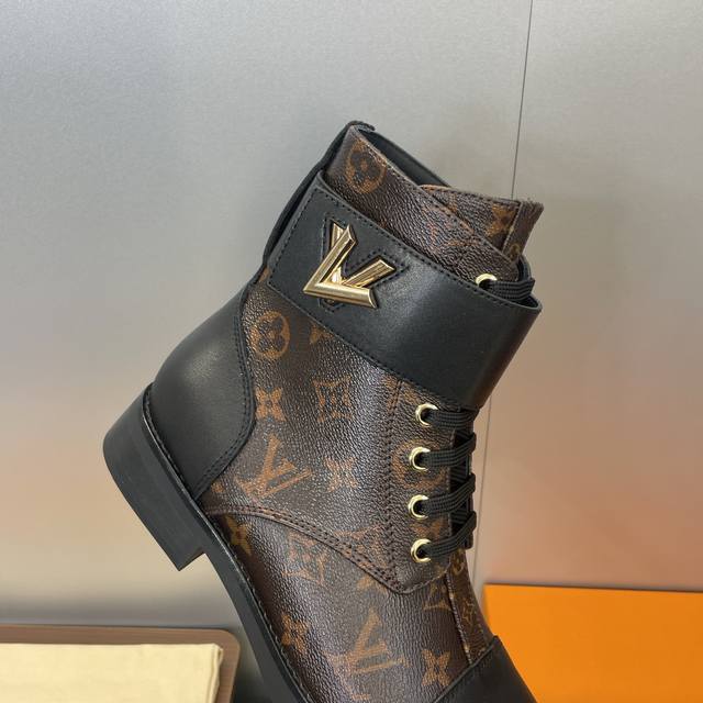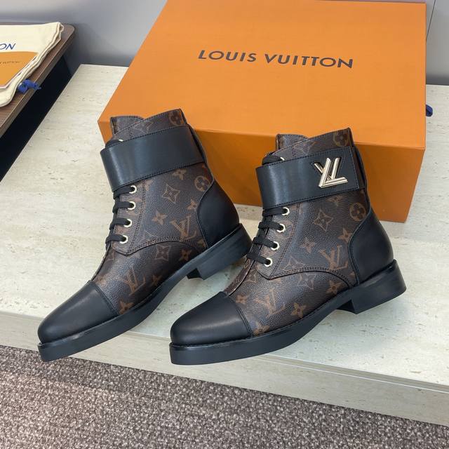/ 工厂p价p Louis Vuitton* 2025秋冬新款朋克风格系带机车短靴 Lv字母Logo五金皮带扣低跟拼色骑士靴 材质:鞋面进口开边珠牛皮 进口老花皮+