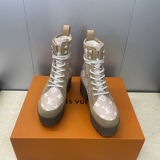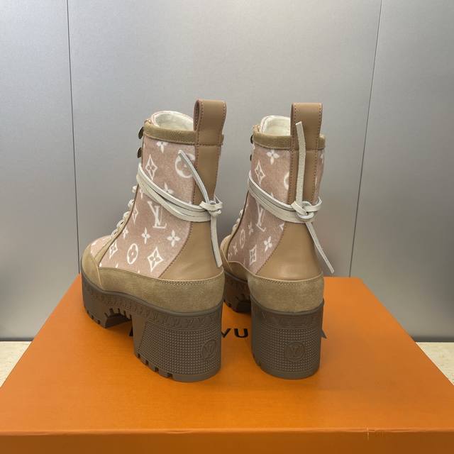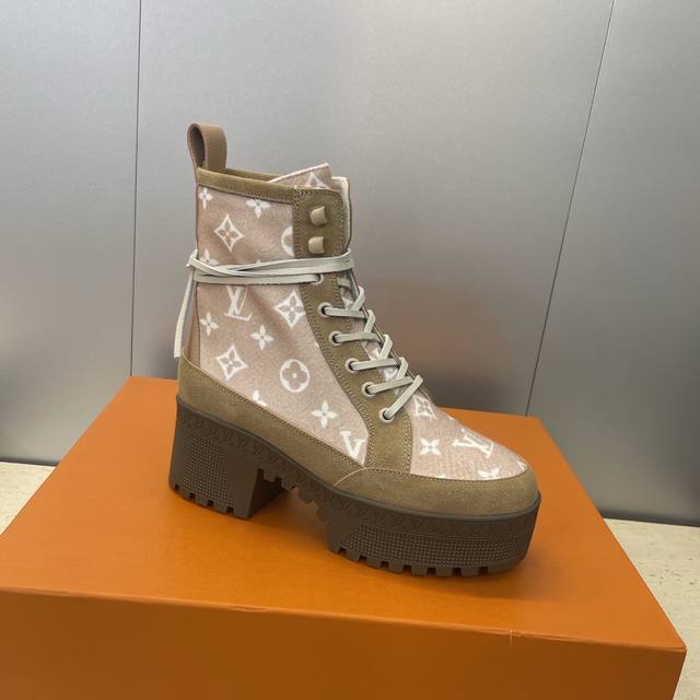 / 工厂p价p Louis Vuitton* 2025秋冬新款系带机车短靴 Lv字母Logo厚底低跟防水台拼色骑士靴 材质:鞋面进口小牛皮 进口羊猄皮 进口环保透气