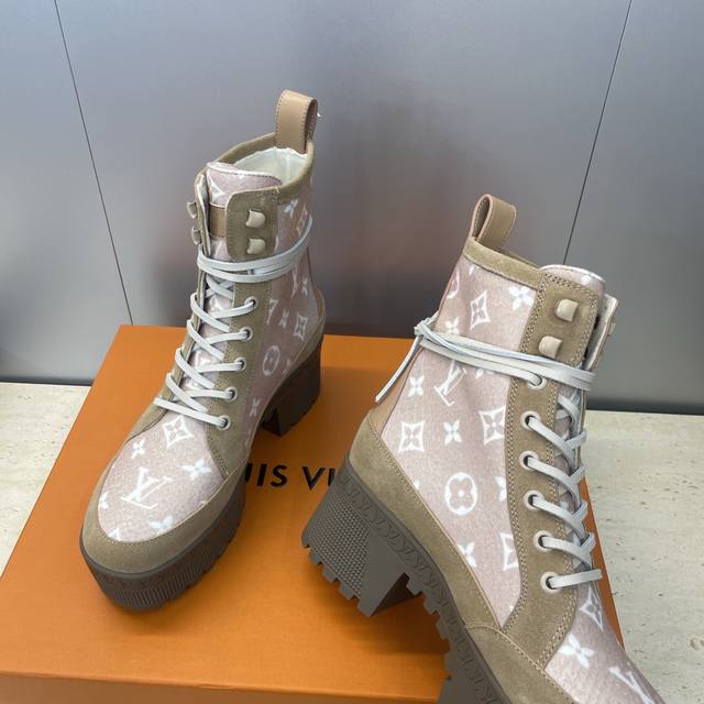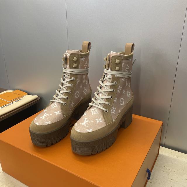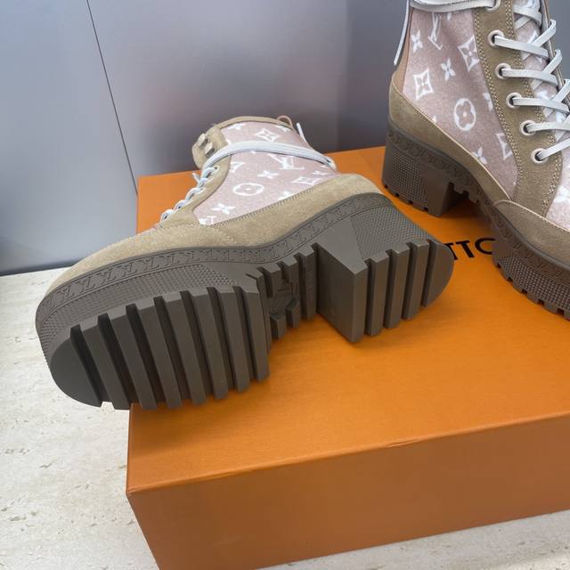 工厂p价p Louis Vuitton* 2025秋冬新款系带机车短靴 Lv字母Logo厚底低跟防水台拼色骑士靴 材质:鞋面进口小牛皮 进口羊猄皮 进口环保透气