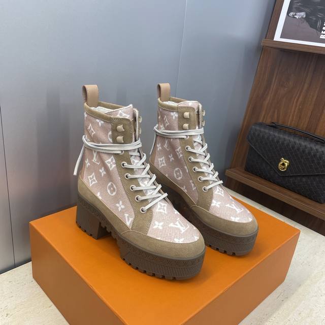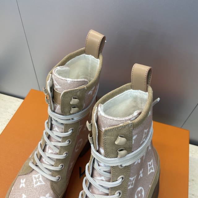 工厂p价p DDD Louis Vuitton* 2025秋冬新款系带机车短靴 Lv字母Logo厚底低跟防水台拼色骑士靴 DDD 材质:鞋面进口小牛皮 进口羊猄皮 进口环保透气科技面料+水染牛皮内里+原版开模大底 DDD 跟高:6Cm DDD Size:女码35-42 42定制不退换 DDD