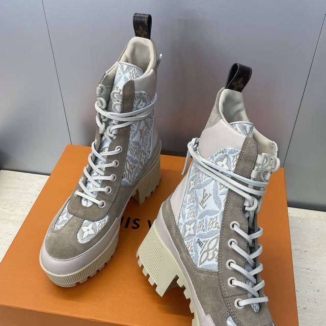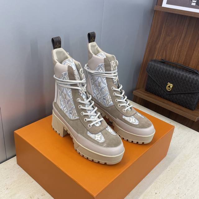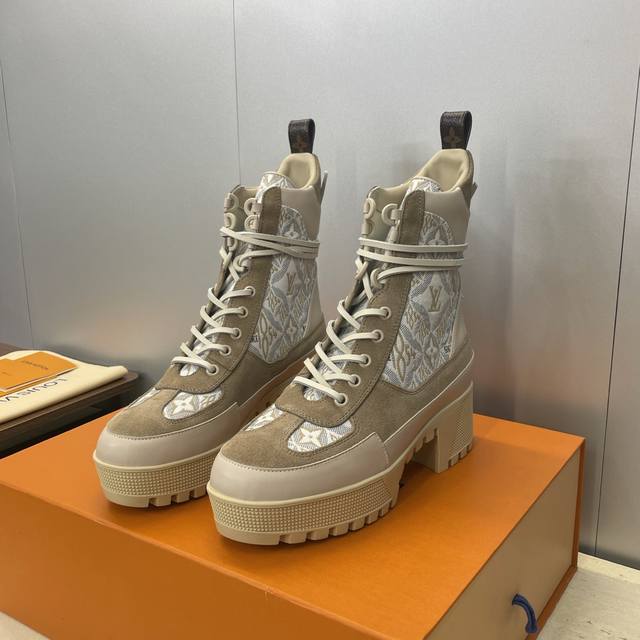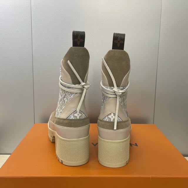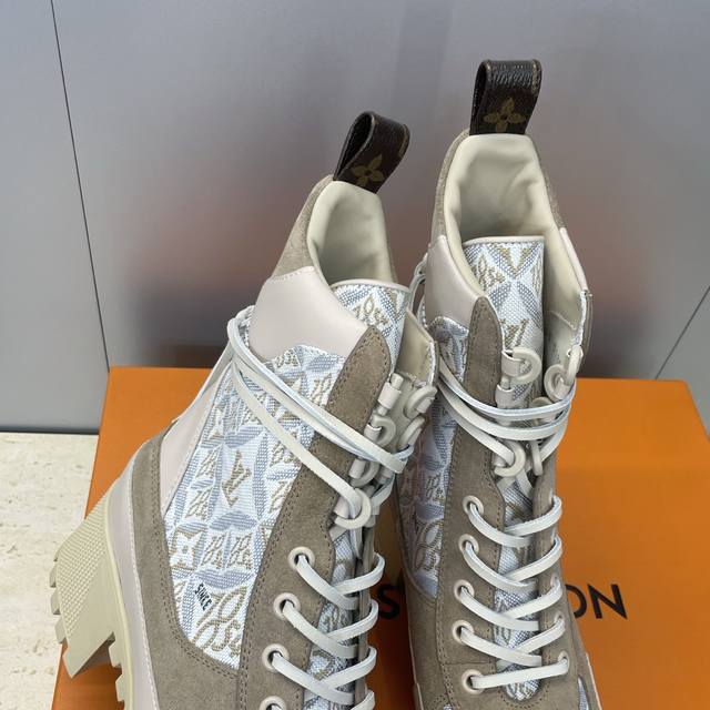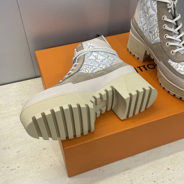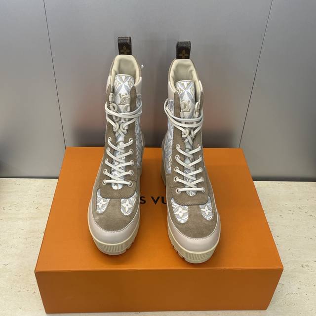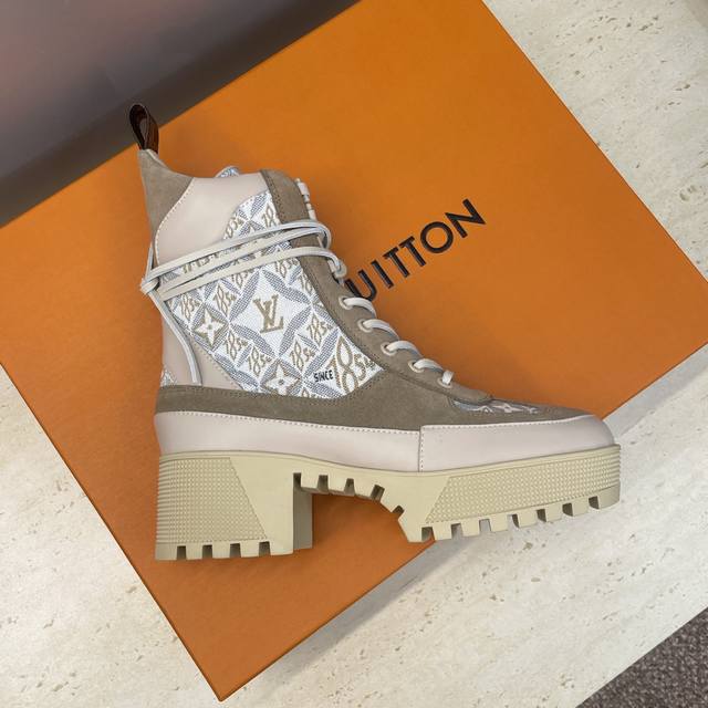 / 工厂p价p Louis Vuitton* 2025秋冬新款系带机车短靴 Lv字母Logo厚底低跟防水台拼色骑士靴 材质:鞋面进口小牛皮 进口老花皮 进口羊猄皮