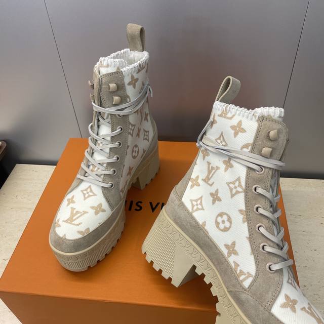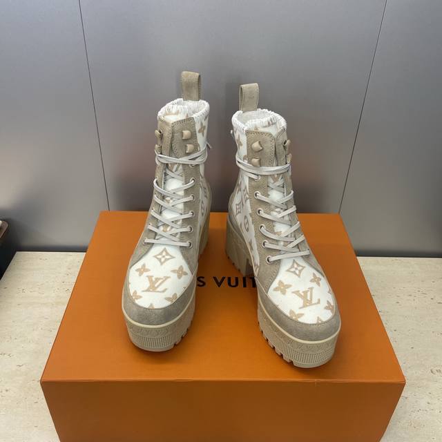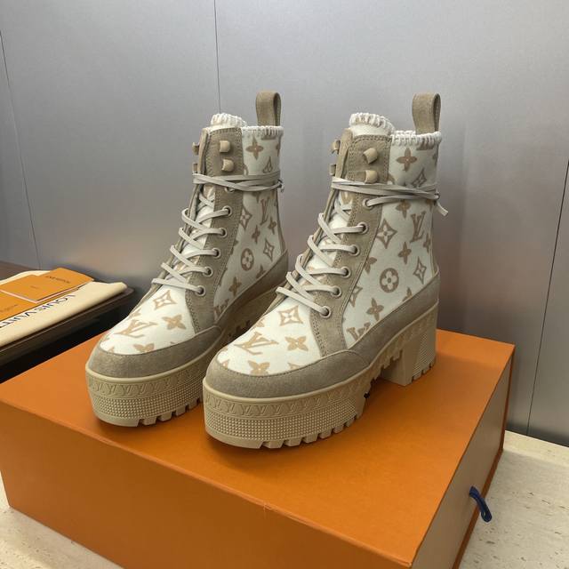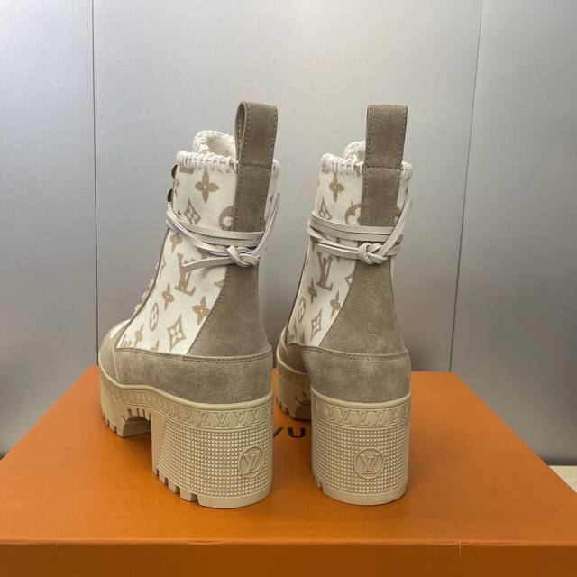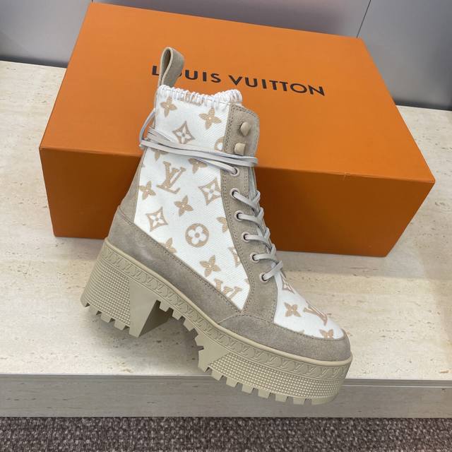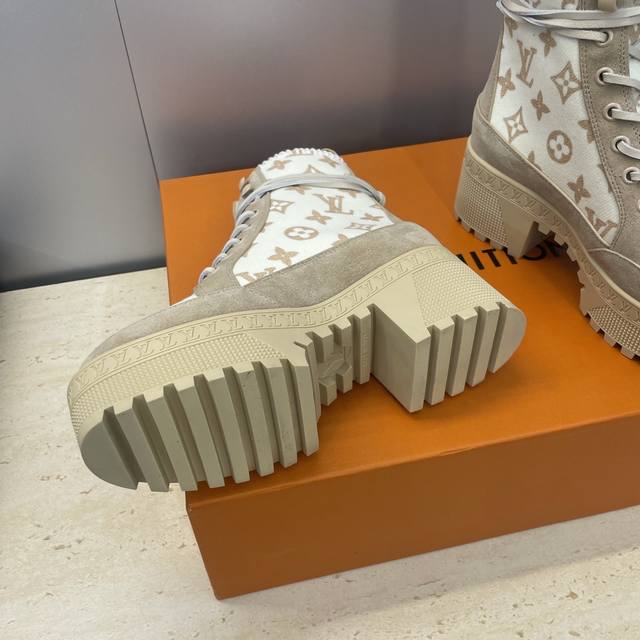/ 工厂p价p Louis Vuitton* 2025秋冬新款系带机车短靴 Lv字母Logo厚底低跟防水台拼色骑士靴 材质:鞋面进口羊猄皮 进口环保透气科技面料+进