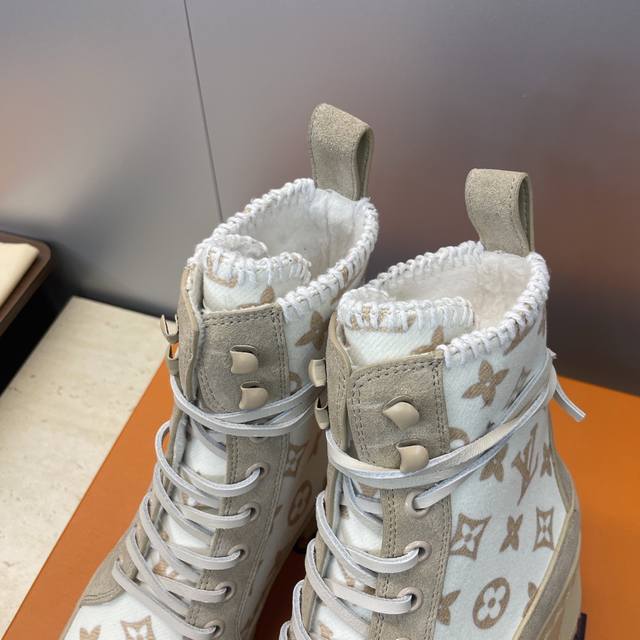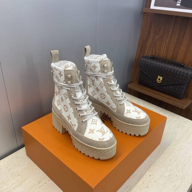 工厂p价p DDD Louis Vuitton* 2025秋冬新款系带机车短靴 Lv字母Logo厚底低跟防水台拼色骑士靴 DDD 材质:鞋面进口羊猄皮 进口环保透气科技面料+进口毛巾布内里+原版开模大底 DDD 跟高:6Cm DDD Size:女码35-42 42定制不退换 DDD