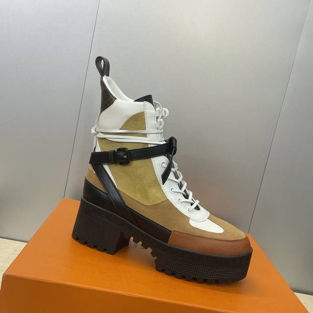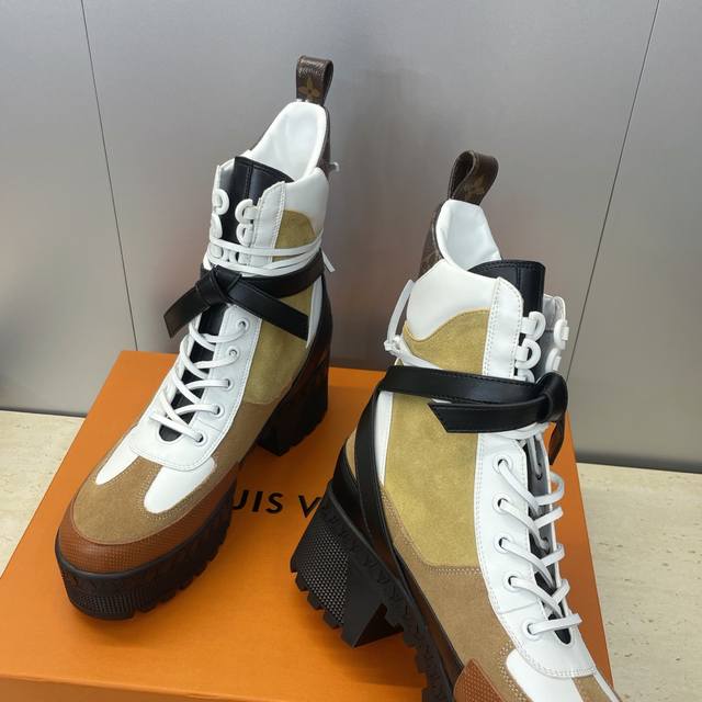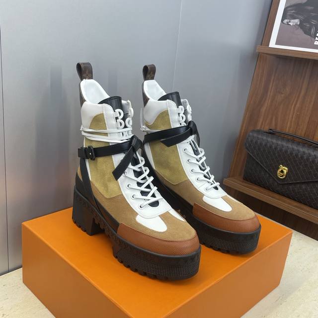 工厂p价p DDD Louis Vuitton* 2025秋冬新款蝴蝶结系带机车短靴 Lv字母Logo厚底低跟防水台拼色骑士靴 DDD 材质:鞋面进口小牛皮 进口羊猄皮皮+水染牛皮内里+原版开模大底 DDD 跟高:6Cm DDD Size:女码35-42 42定制不退换 DDD