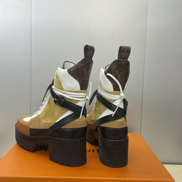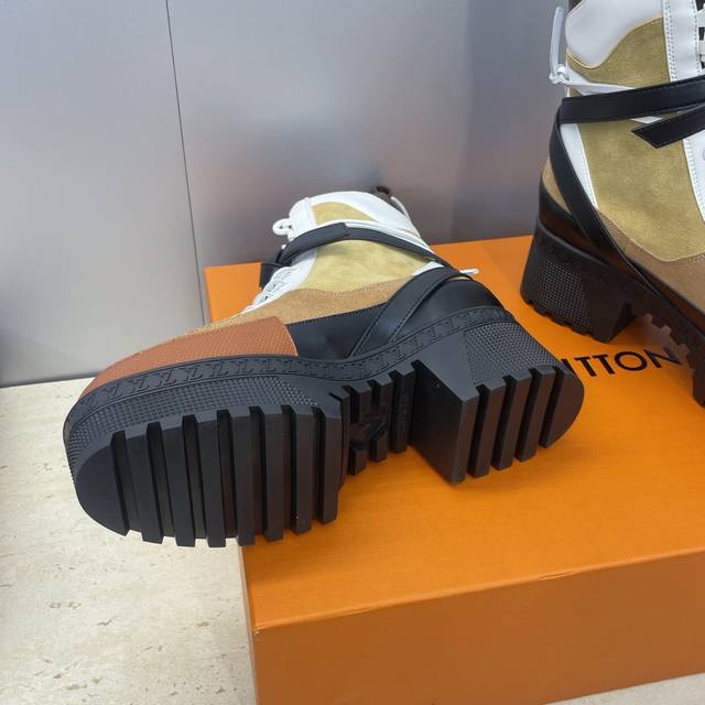 / 工厂p价p Louis Vuitton* 2025秋冬新款蝴蝶结系带机车短靴 Lv字母Logo厚底低跟防水台拼色骑士靴 材质:鞋面进口小牛皮 进口羊猄皮皮+水染