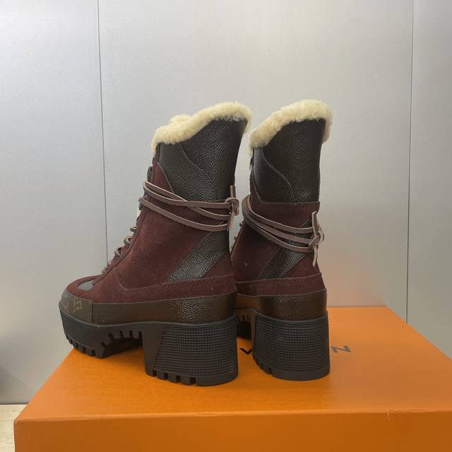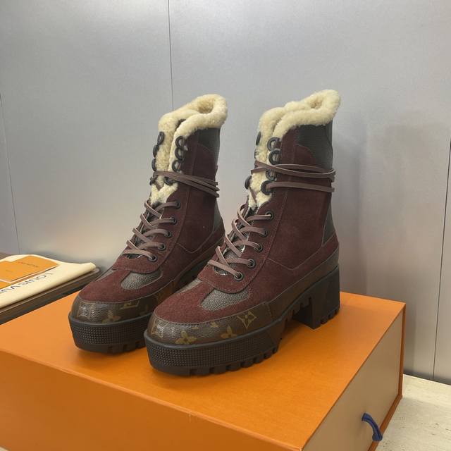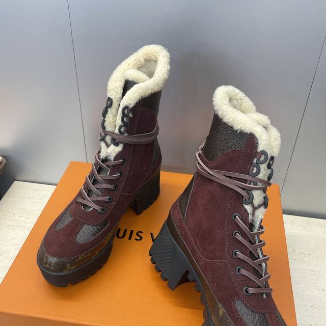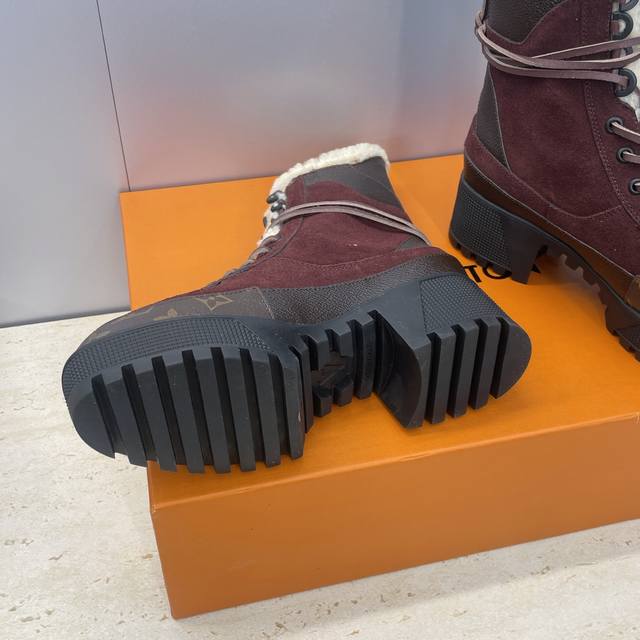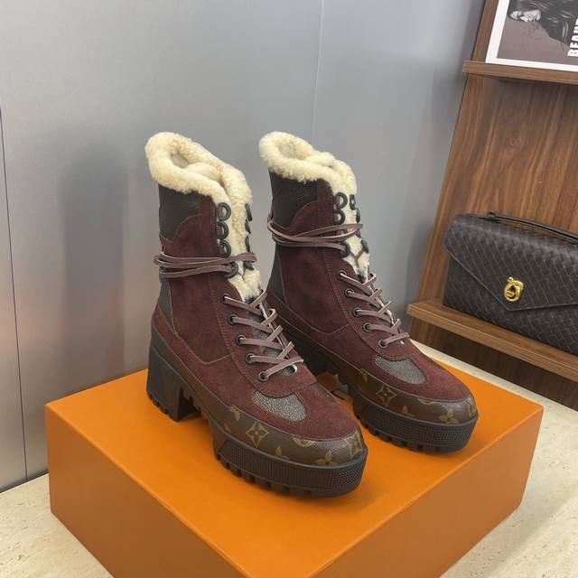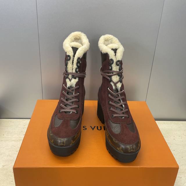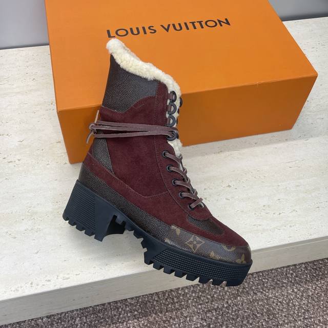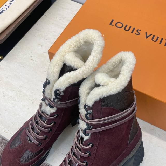 工厂p价p Louis Vuitton* 2025秋冬新款防寒保暖羊羔毛系带机车短靴 Lv字母Logo厚底低跟防水台拼色骑士靴 材质:鞋面进口小牛皮 进口老花皮
