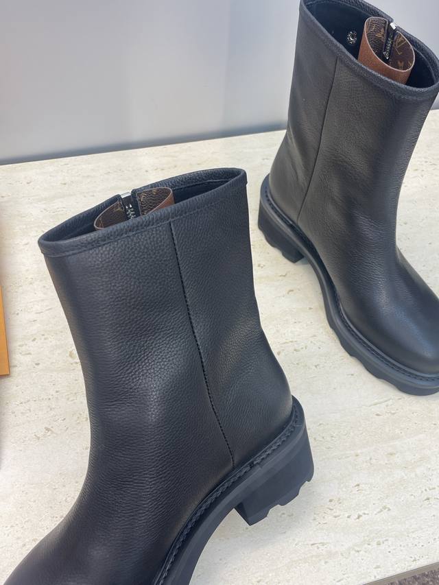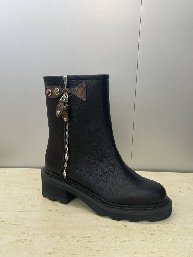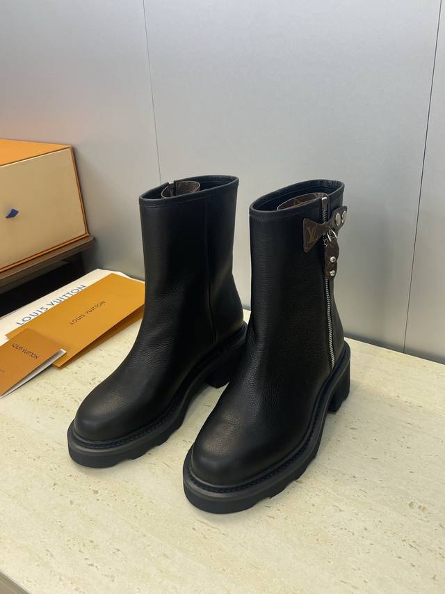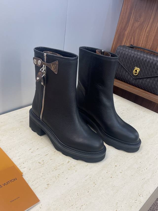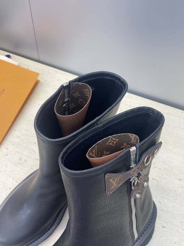 工厂p价p Louis Vuitton* 2025秋冬新款 Beaubourg朋克风格侧拉链机车及裸女短靴 Lv字母Logo五金老花皮带扣厚底圆头低跟拼色骑士靴