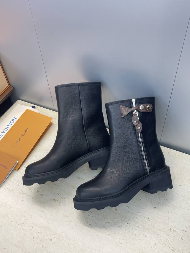 工厂p价p DDD Louis Vuitton* 2025秋冬新款 Beaubourg朋克风格侧拉链机车及裸女短靴 Lv字母Logo五金老花皮带扣厚底圆头低跟拼色骑士靴 DDD 材质:鞋面进口小牛皮+环保透气织物内里+水染羊皮垫脚+原版开模大底 DDD 跟高:4.5Cm DDD Size:女码35-41 40.41定制不退换 DDD