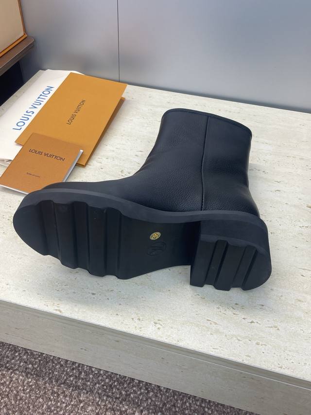/ 工厂p价p Louis Vuitton* 2025秋冬新款 Beaubourg朋克风格侧拉链机车及裸女短靴 Lv字母Logo五金老花皮带扣厚底圆头低跟拼色骑士靴