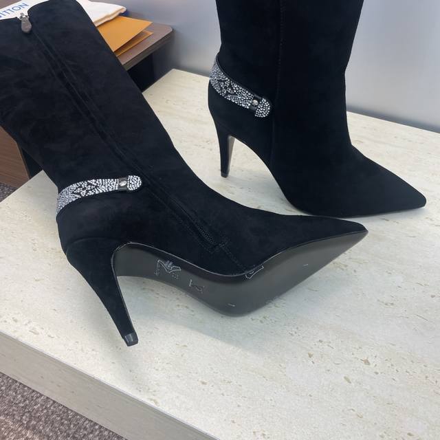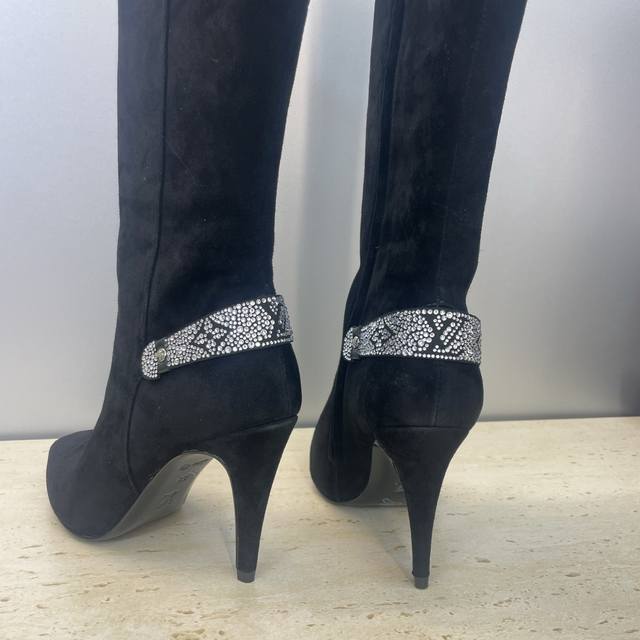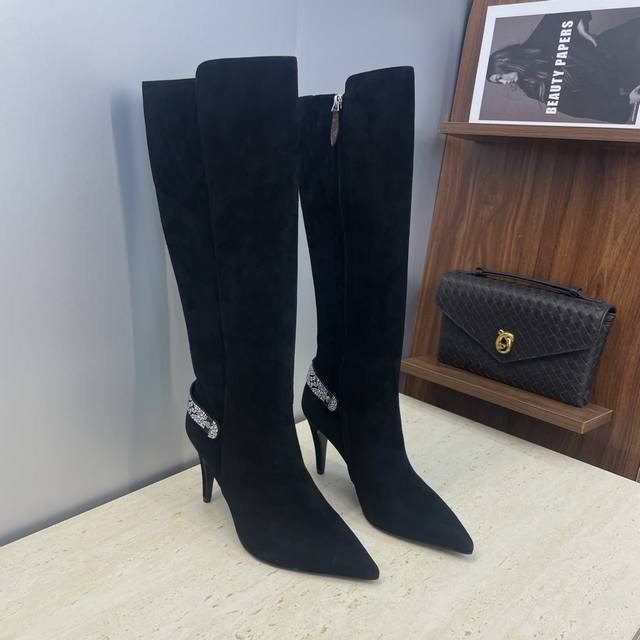 工厂p价p DDD Louis Vuitton* 2025秋冬新款Legacy 侧拉链水钻机车及膝女长靴 Lv字母Logo高跟尖头拼色高筒马丁骑士靴 DDD 材质:鞋面进口小牛皮 进口羊猄皮+进口环保透气织物内里+水染羊皮垫脚+意大利真皮大底 DDD 跟高:9.5Cm DDD Size:女码35-41 40.41定制不退换 DDD