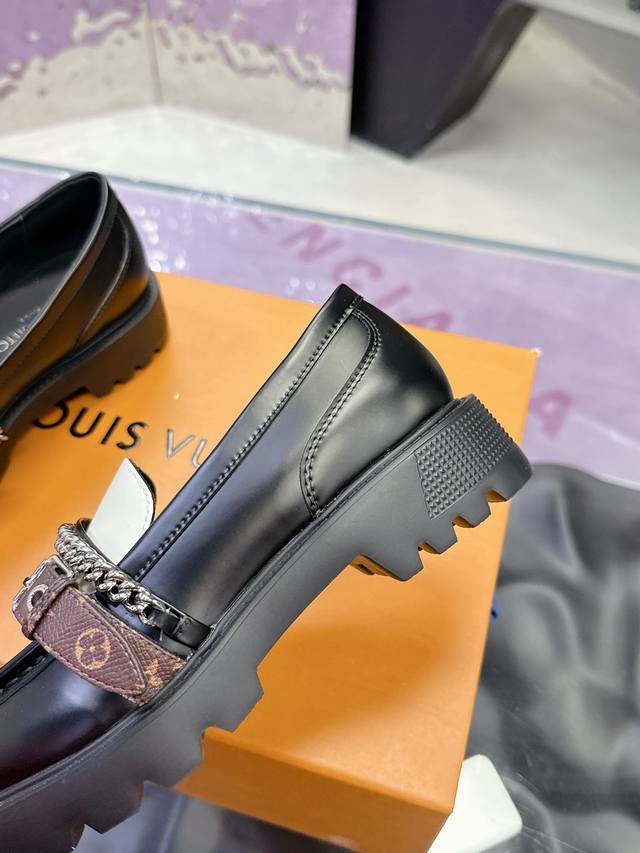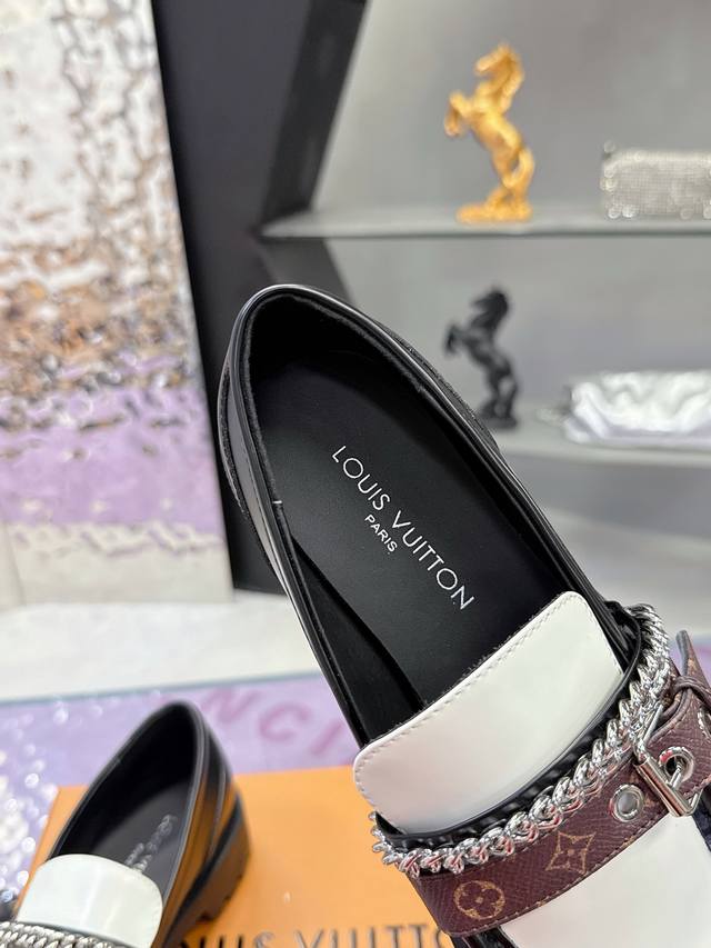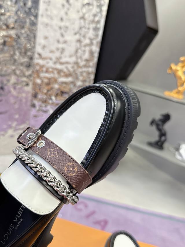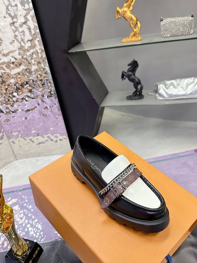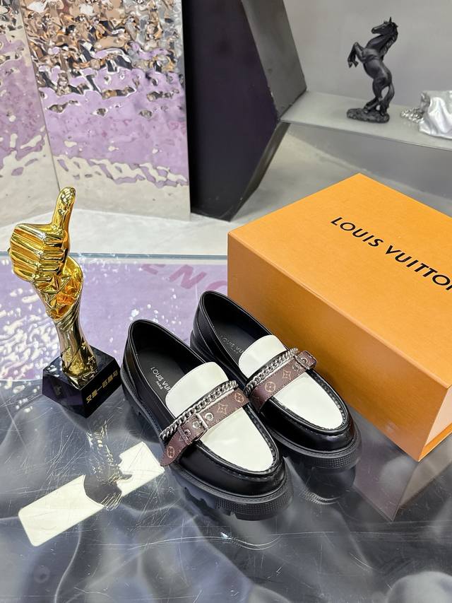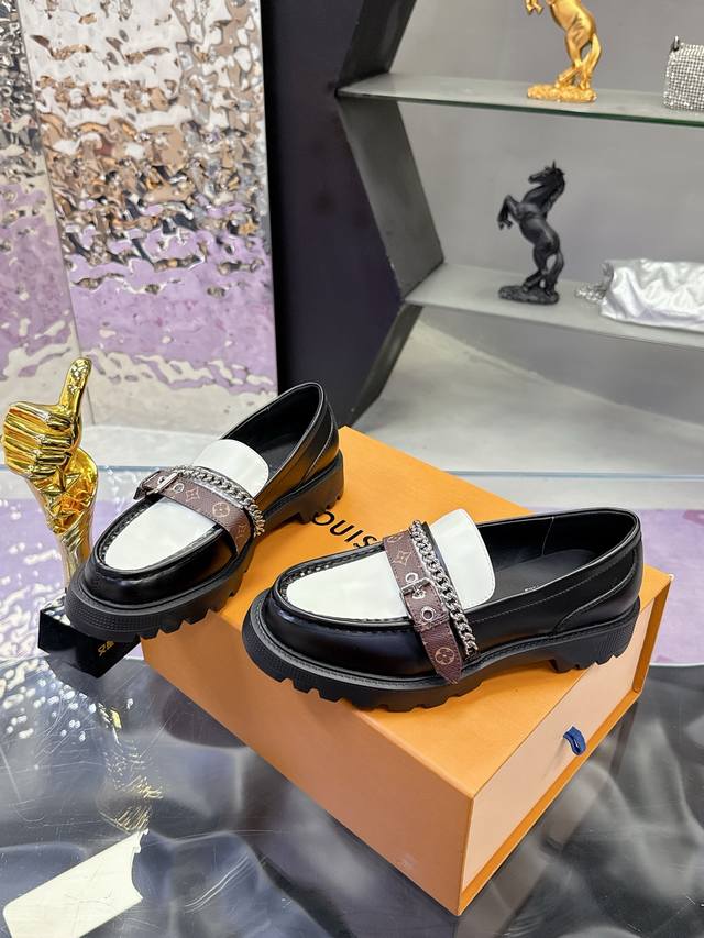 工厂p价p: DDD Lv 驴牌25Wf春夏新品老花 DDD 厚底乐福鞋 DDD 当老花图腾邂逅工装锋芒这款乐福鞋以跨界巧思重构经典。 DDD 老花织带勾勒硬箱手柄般的利落线条在复古质感中注入街头张力。厚底设计暗藏双重心机 DDD 3-4Cm增高幅度悄然拉伸比例行走间自带气场 高级感满满内嵌缓震鞋垫搭配弹力工艺兼顾支撑性与脚感通勤暴走或日常出街皆无压力。 DDD 从九分西裤的利落通勤到百褶裙的慵懒随性甚至搭配荧光袜解锁潮流巧思一双鞋即可贯通多元风格。 DDD 让每一步都踏在经典与前卫的平衡点上无需刻意修饰
