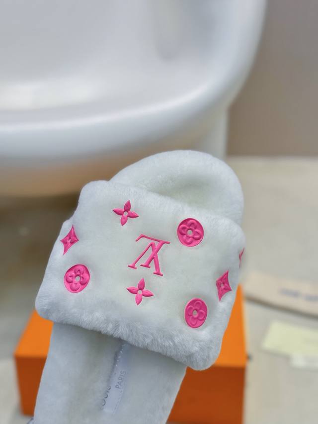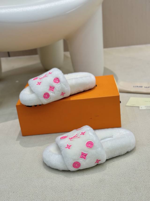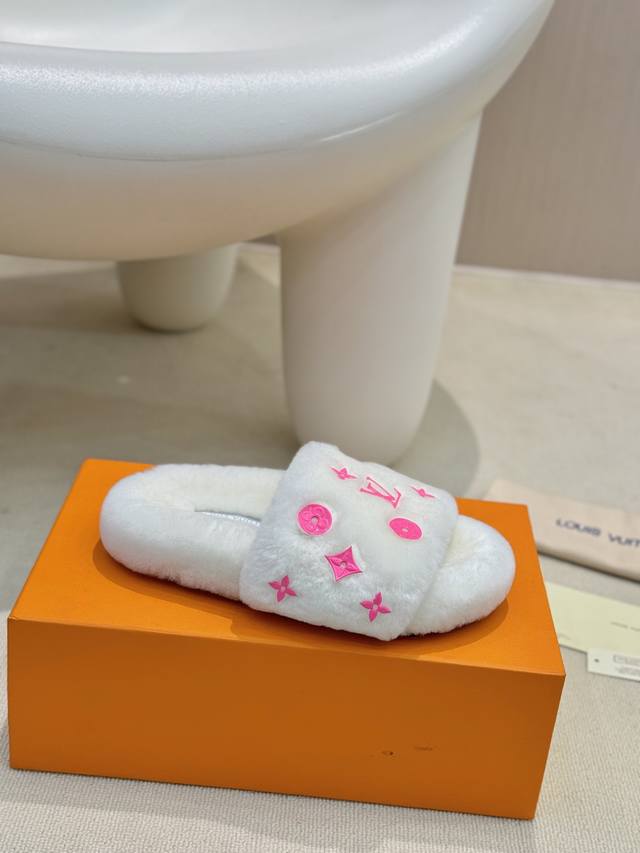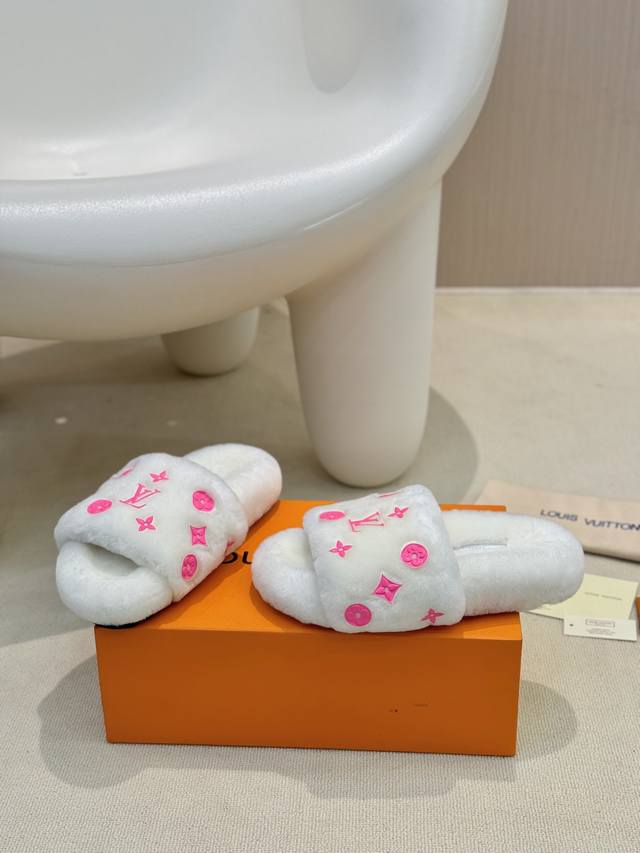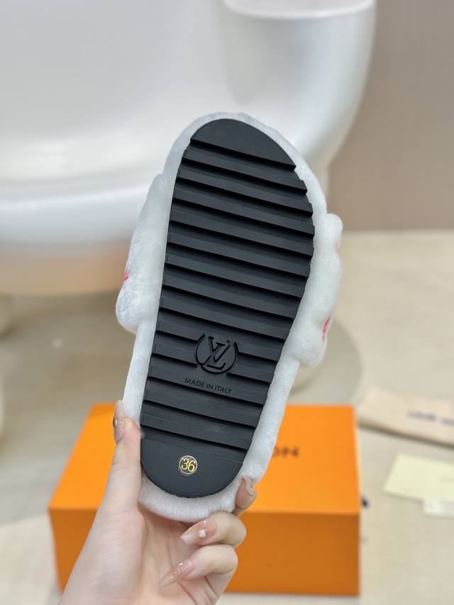 工厂P直批: Louis Vuitton 新款羊毛拖鞋细柔软羊毛 頂级品质纯皮毛一体直毛打造!超温暖的感觉,穿上仿佛踩在云朵上Lv经典老花装饰,精致高级!让这双毛拖身价陡增!鞋底是原版开模的Eva发泡防滑大底,非常好穿不打滑,而且鞋底有一定厚度,舒适度极佳! 鞋面:原版进口羊毛 内里:原版进口羊毛 垫脚:原版进口羊毛 大底:原版开模发泡底 包装:原版全套抽屉盒 码数:35-40 40、41定制不退换