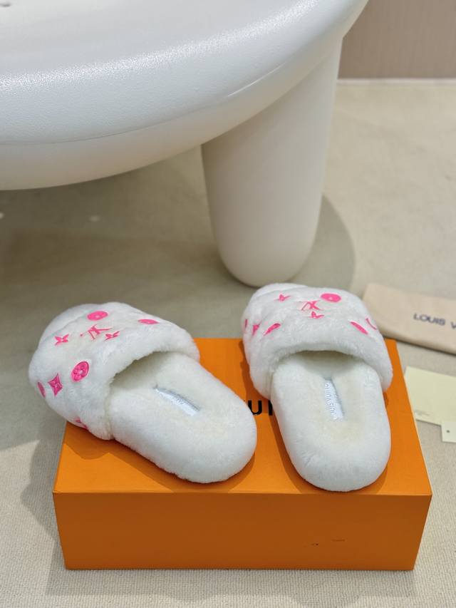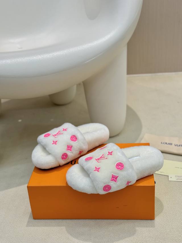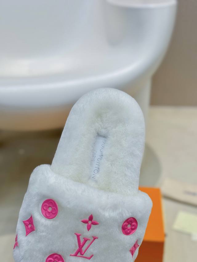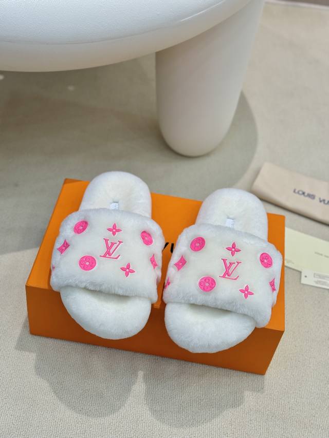 / 工厂P直批: Louis Vuitton 新款羊毛拖鞋细柔软羊毛 頂级品质纯皮毛一体直毛打造!超温暖的感觉,穿上仿佛踩在云朵上Lv经典老花装饰,精致高级!让这双