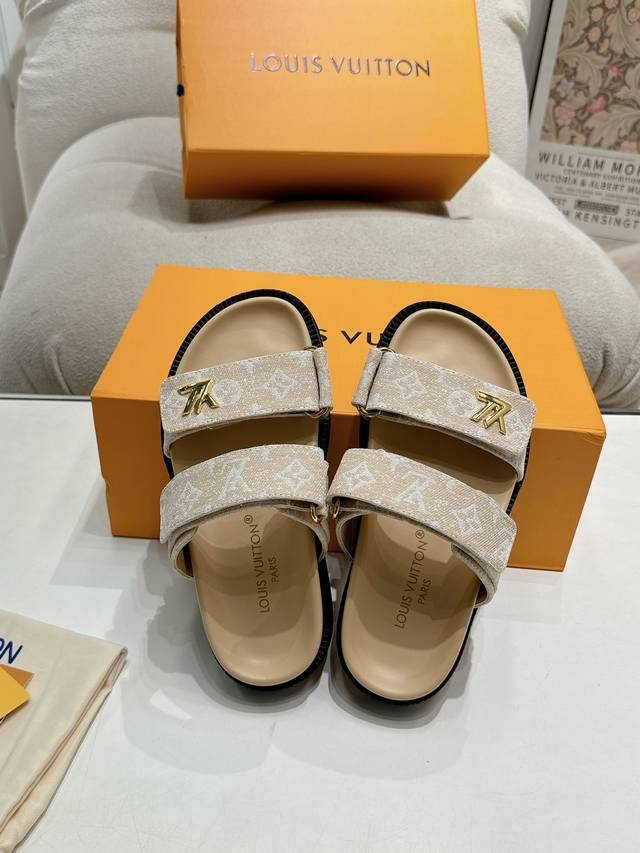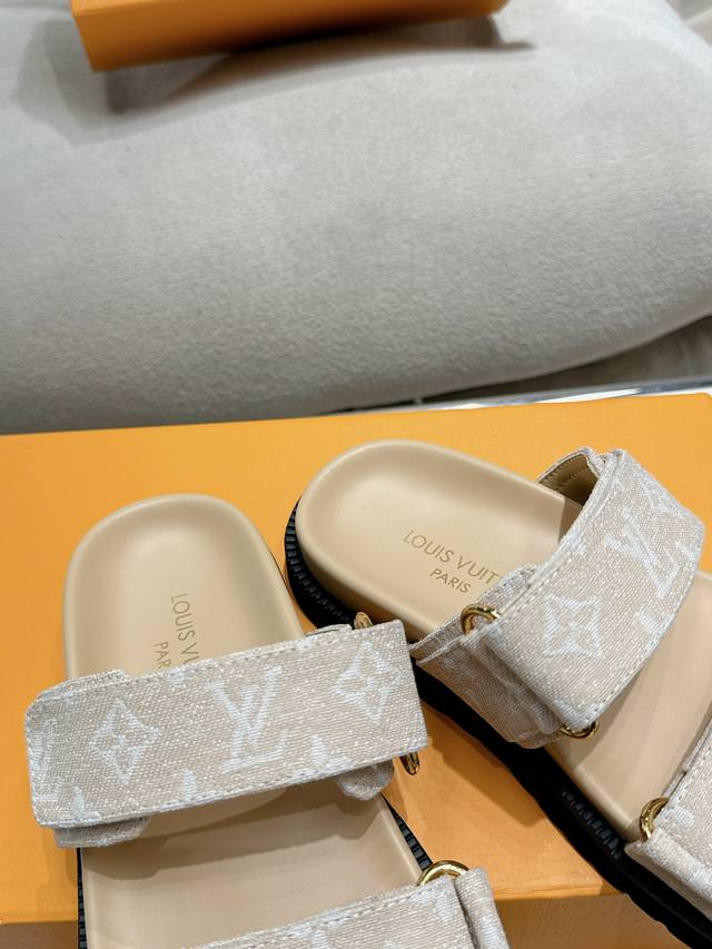 / 拖鞋 凉鞋 Louis Vuitton 路易威登女士 新款凉鞋 Lv Sunset Comfort平底凉鞋以精致拉菲草鞋面道出手工艺格调,搭配韧性鞋垫和轻盈微型