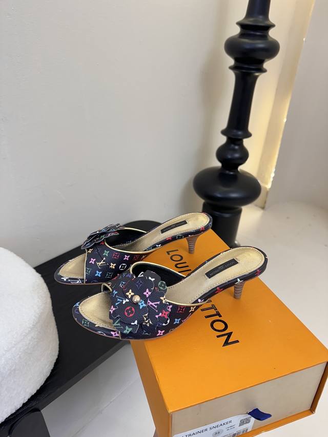 拖鞋 驴家新品 New Arrival~Lv春夏单宁猫跟拖鞋.单宁色搭配的棕色皮质,也太出彩了! 刚刚好的小猫跟,性感舒适,拉满了夏日美鞋能给的满分情绪价值.凉