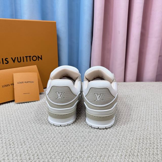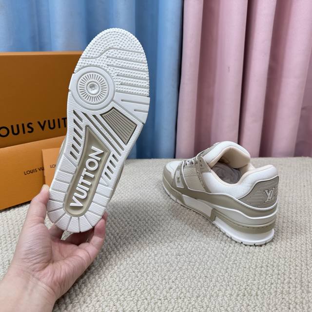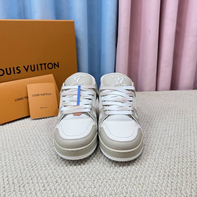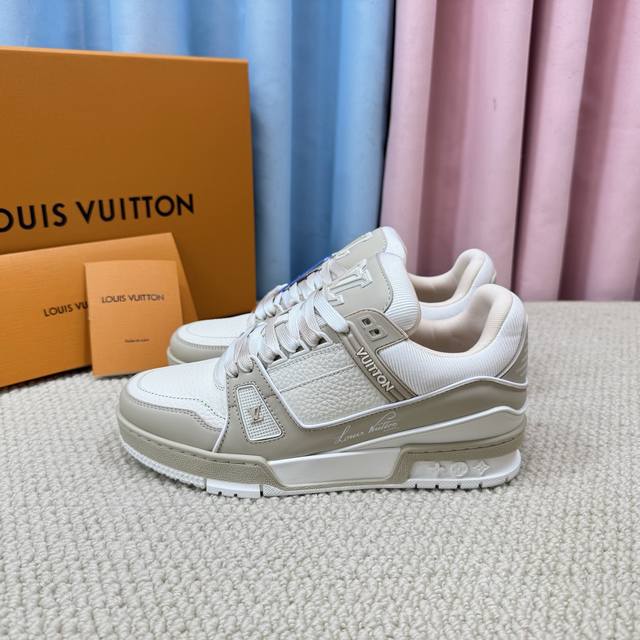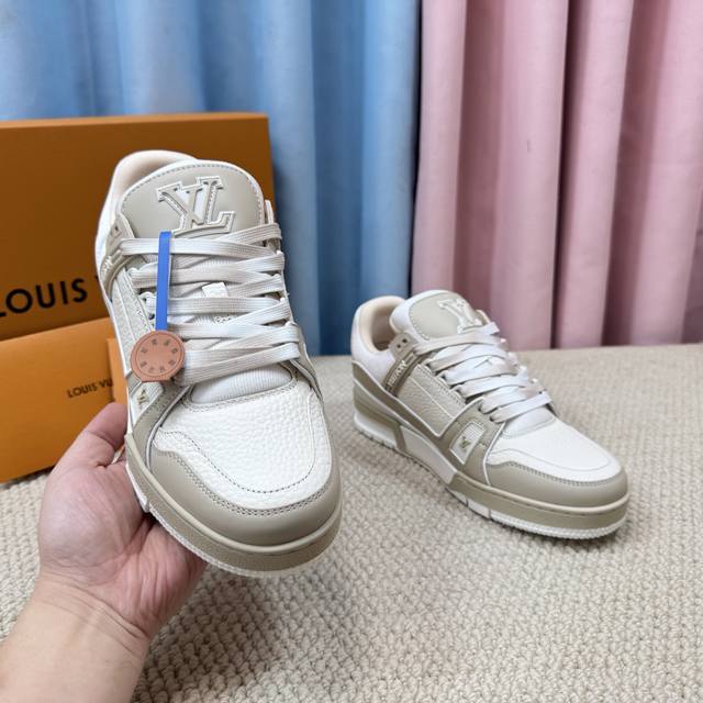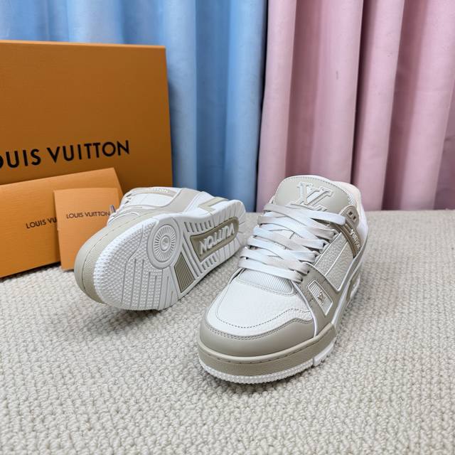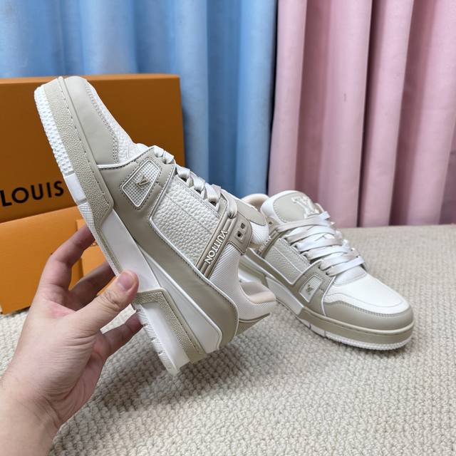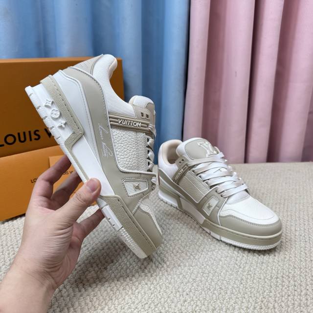 新款情侣 DDD Lv-Trainer路易-威登 pk市场一切版本 情侣款 DDD 走秀新款 篮球板鞋 代购品质 DDD 原版1:1开发复刻!!上脚非常舒适 做工精细 DDD 鞋面由意大利进口小牛皮拼接,侧边饰有品牌Logo标志及签名,进口了透气网布内里,脚感超舒适。原厂特供原版双色Tpu吸模大底。套包工艺 固特异缝合锁边 DDD Size:女款35-40 DDD 男款39-45标准码 男38 46 47+30定做不退不换 DDD