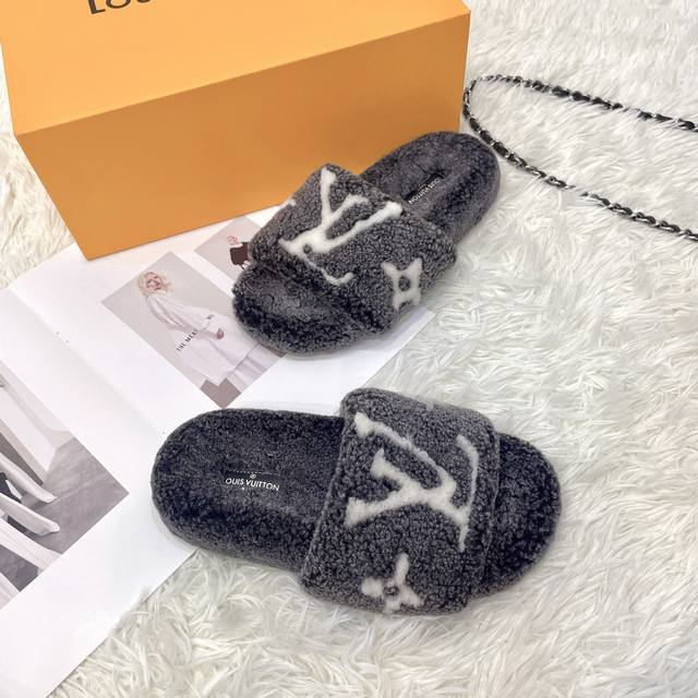 新款 Louis Vuitton Lv毛拖 染色工艺 一款巨型潮流的秋冬厚毛拖,超舒服、我家只做全真皮羊羔毛 奢华的羊毛质感让你的美足更加美丽、信心、舒心十足,非常适合居家外出皆宜的必备品, 面料:真皮羊羔毛 垫脚:真皮羊羔毛 大底:橡胶耐磨大底 码数:35–40 40订做不退换