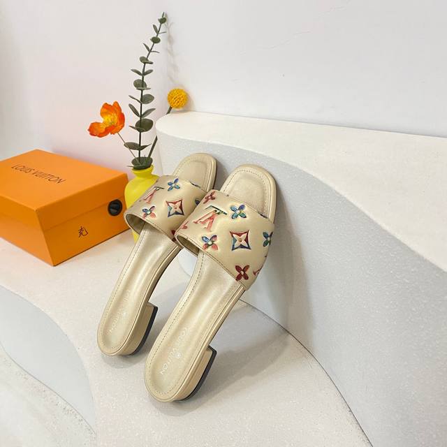橙子出厂价p louis Vuitton 路易威登 夏季新款 Lv彩色压纹方头平底拖鞋 休闲凉拖 码数 34-42