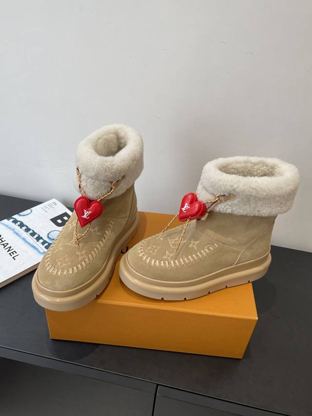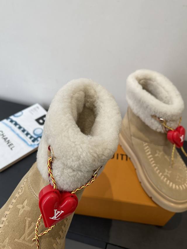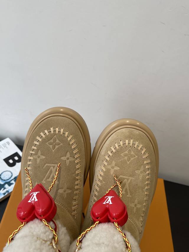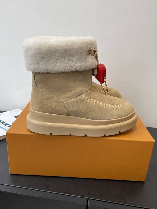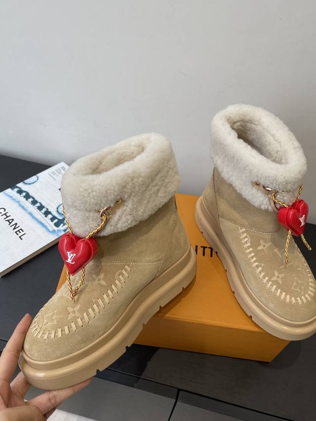 / 爱心配饰¥P120} DDD 路易威登 新品滑雪系列 雪地靴 毛毛靴 DDD 以绒面牛皮革呈现丝绒质感 搭配柔暖羊毛皮内衬 鞋面的 字母缝线和可调节鞋带的铭纹搭