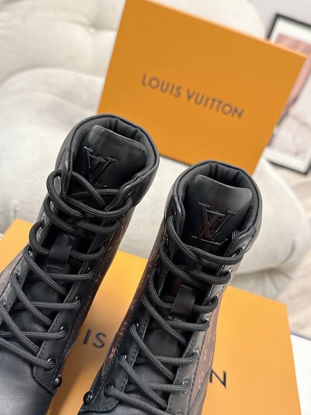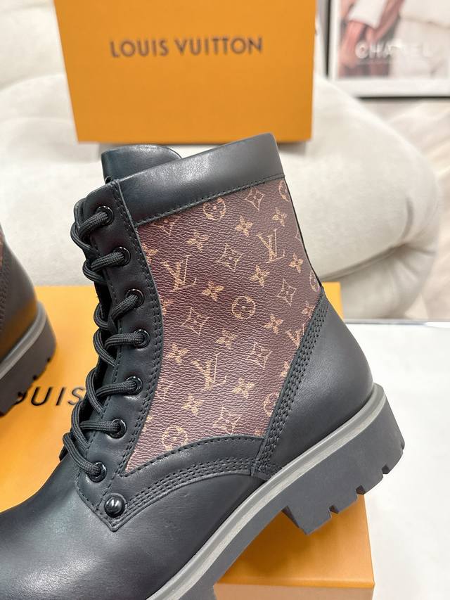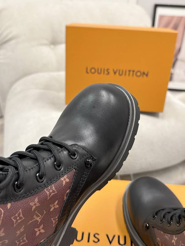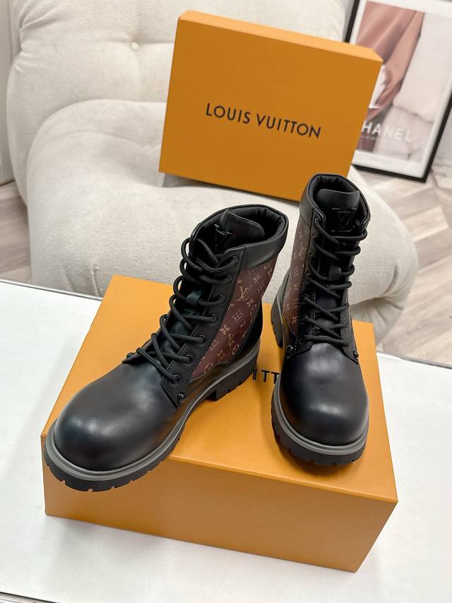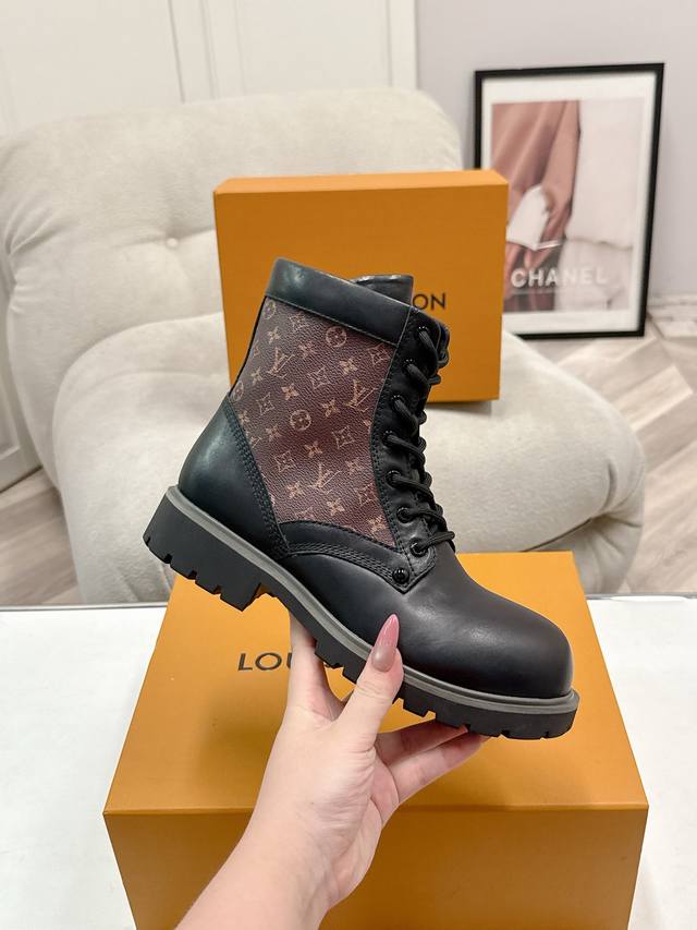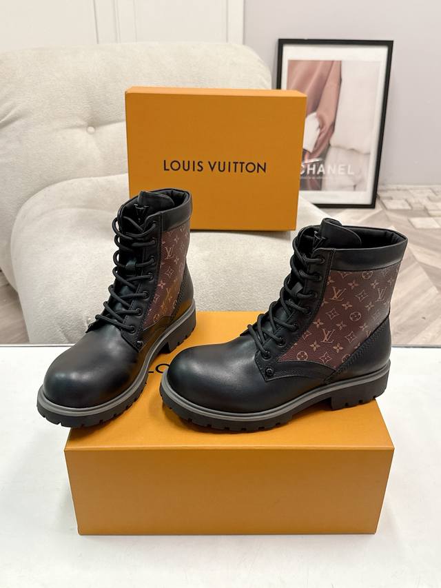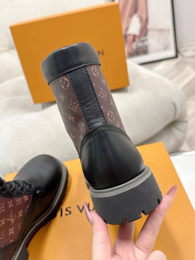 FFF 码数:女35-39男39-44 女40男45.46定做不退换 DDD 25Ss早秋新款Louis Vuiteeon Lv Bubble 系带鞋男女厚底小皮鞋马丁靴 DDD Lv Bubble 系带鞋取材光滑牛皮革,巧妙诠释Pharrell Williams和 Nigo于2025 秋冬秀场传递的日式工装美学。繁复对称的鞋面点缀撞色缝线和Monogram花卉形状孔眼,压印路易威登标识的皮革后袢致意皮具系列设计。 DDD 鞋面:牛皮 DDD 内里垫脚:牛皮 DDD 鞋底:原版开模Tpu橡胶大底 DDD