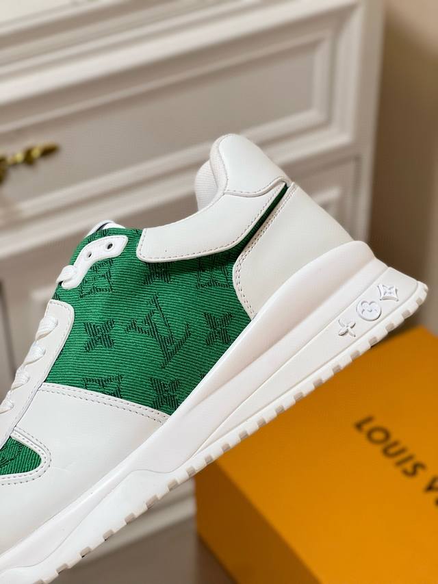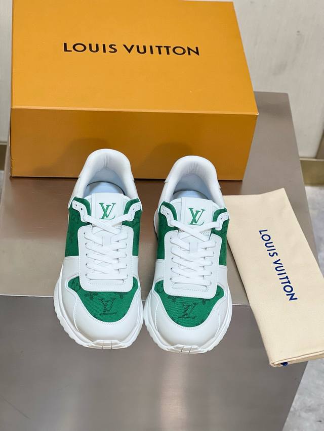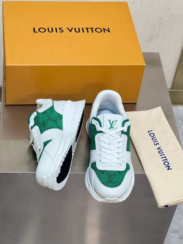 FFF 码数38-45 新品 Loui*V ~ Run Away 高端男士休闲 运动鞋! DDD 采用拼接 Epi 牛皮革和 Monogram 压纹粒面牛皮革,再现传统跑鞋的灵感启发。楔形外底延续标志性设计,品牌字母和标识分饰鞋舌和后尾。 DDD