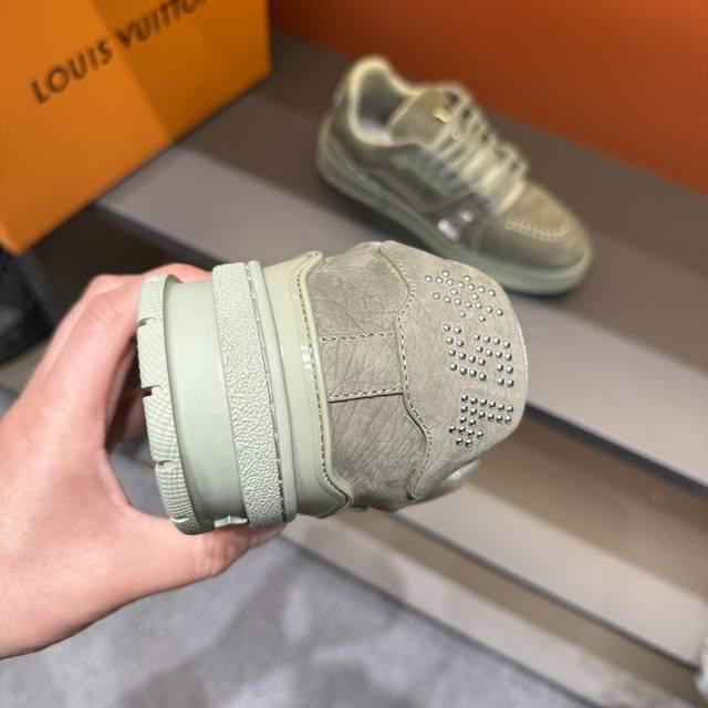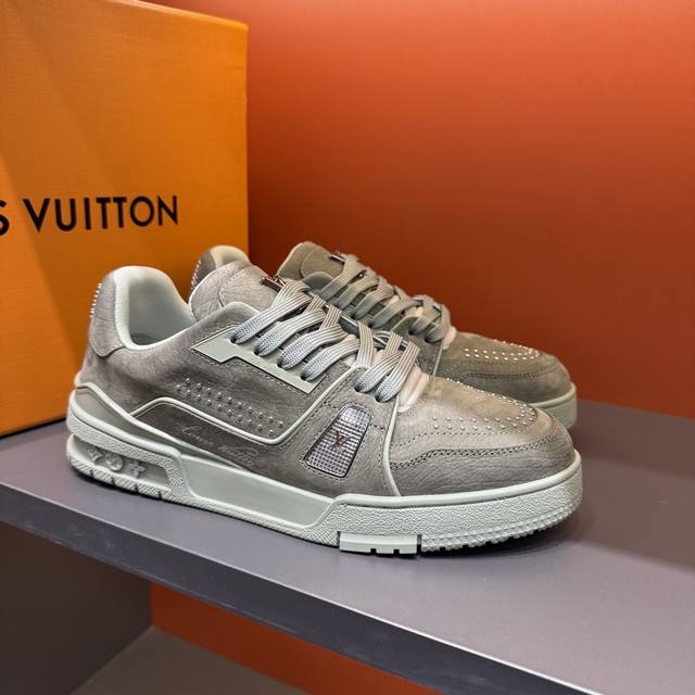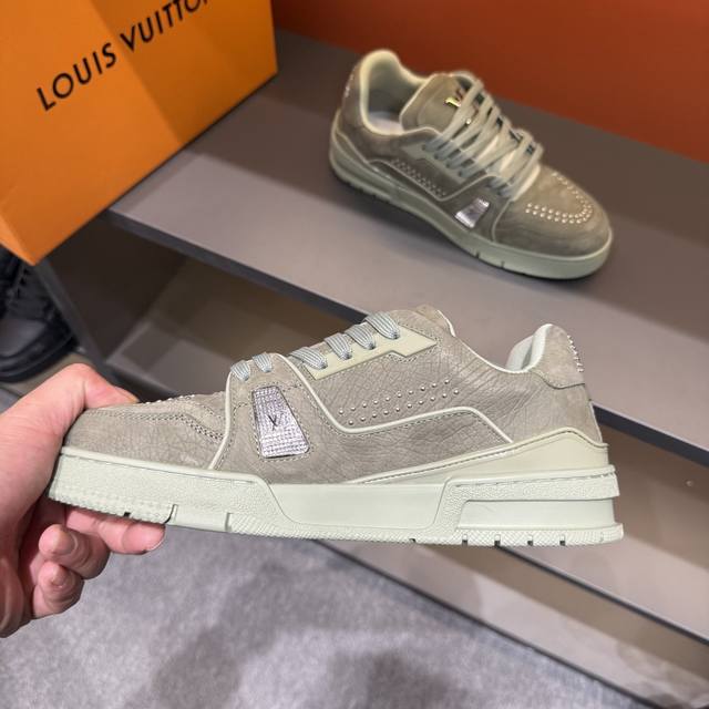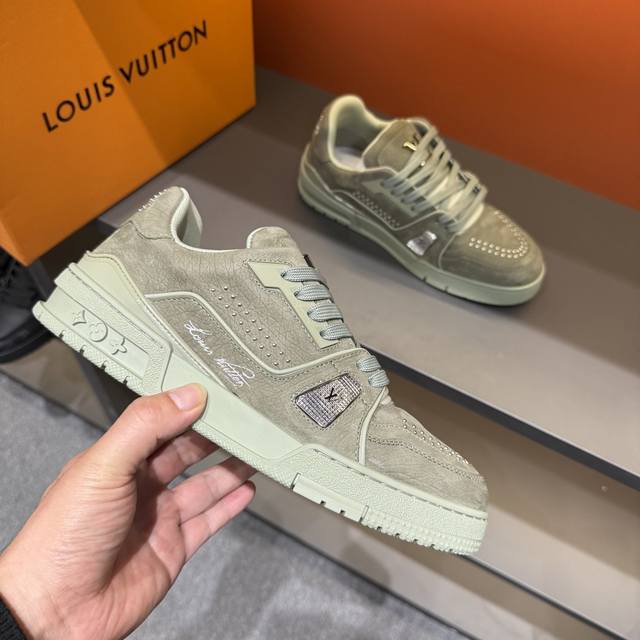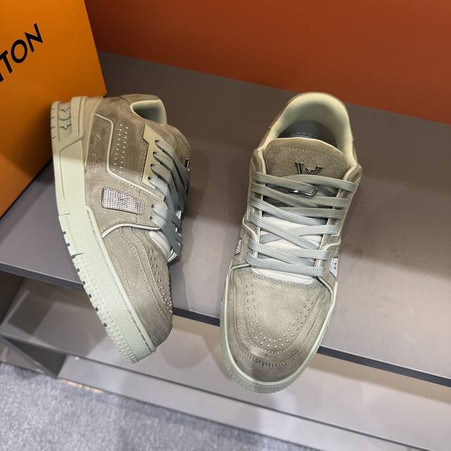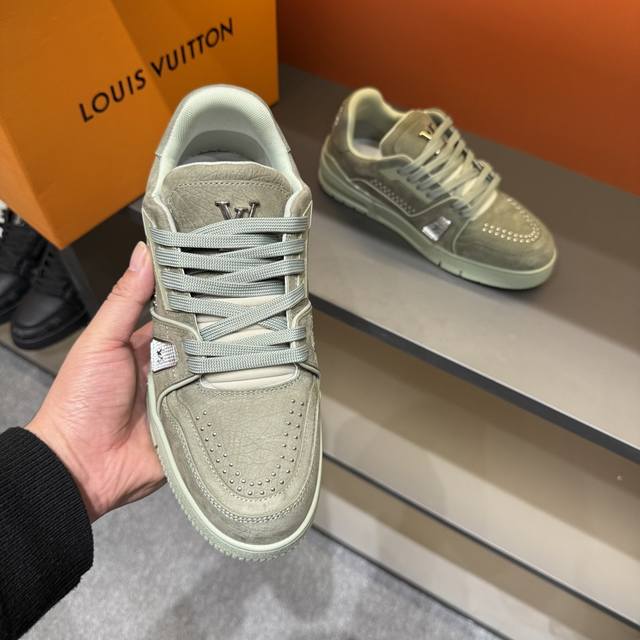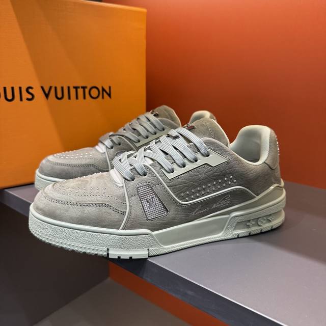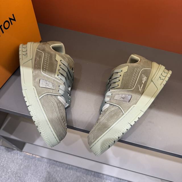 码数38-45 驴家 新配色本款 Lv Trainer 运动鞋取材柔软粒面小牛皮,呈现纯净色调,后部#54标识追溯品牌诞生于1854年,设计师手写体品牌标识点缀