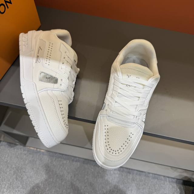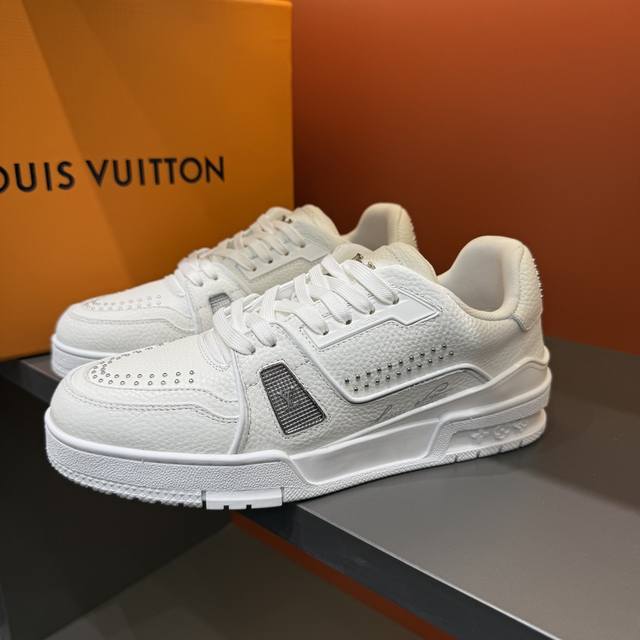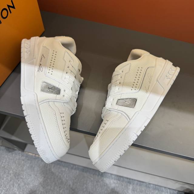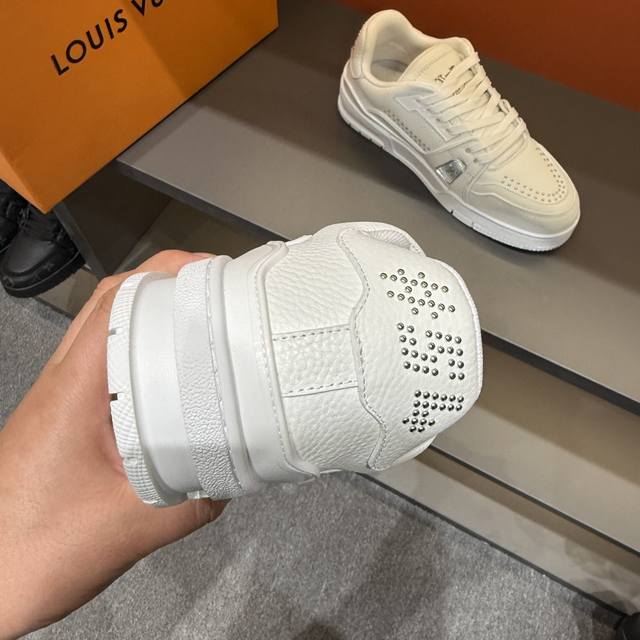 码数38-45 驴家 新配色本款 Lv Trainer 运动鞋取材柔软粒面小牛皮,呈现纯净色调,后部#54标识追溯品牌诞生于1854年,设计师手写体品牌标识点缀