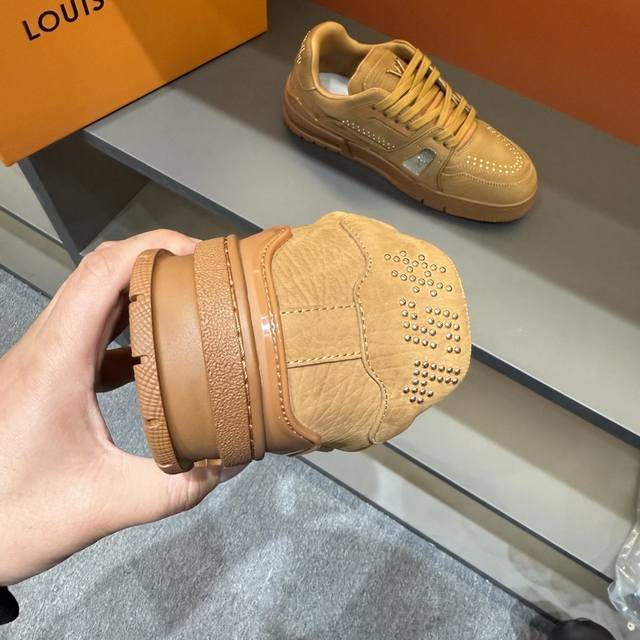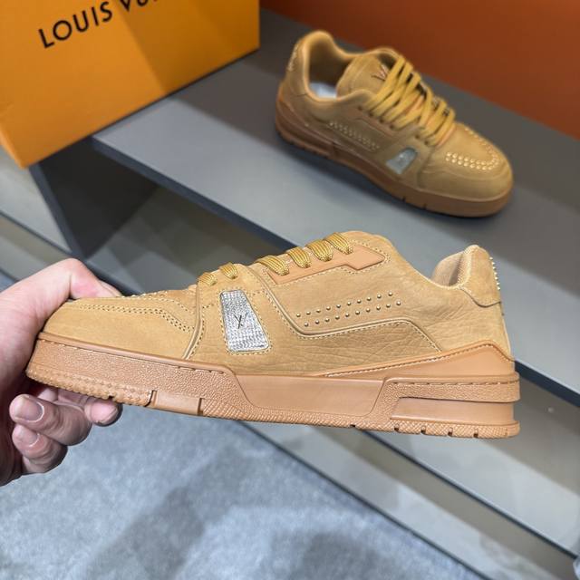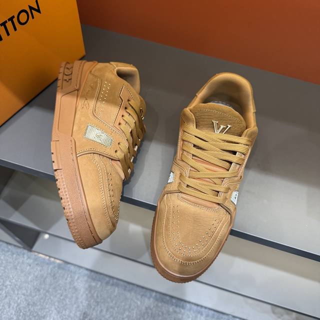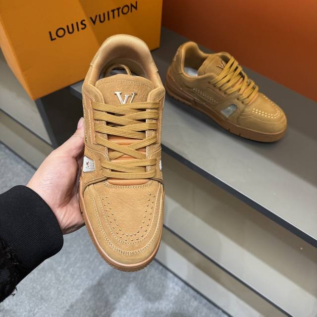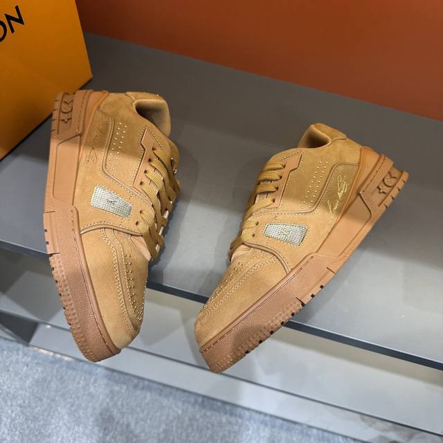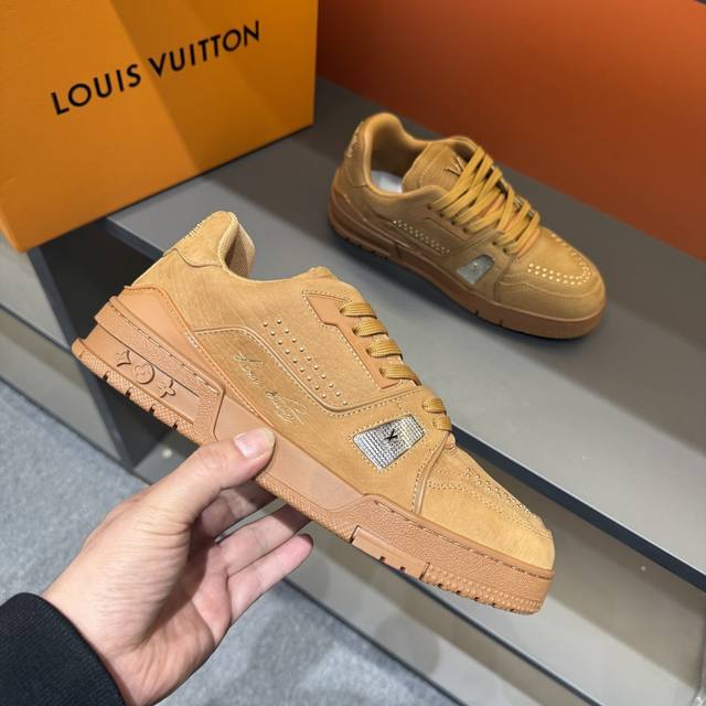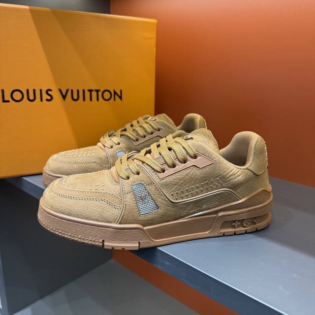 码数38-45 驴家 新配色本款 Lv Trainer 运动鞋取材柔软粒面小牛皮,呈现纯净色调,后部#54标识追溯品牌诞生于1854年,设计师手写体品牌标识点缀