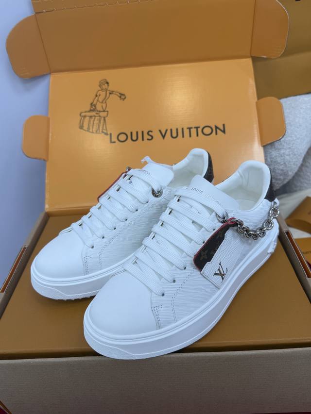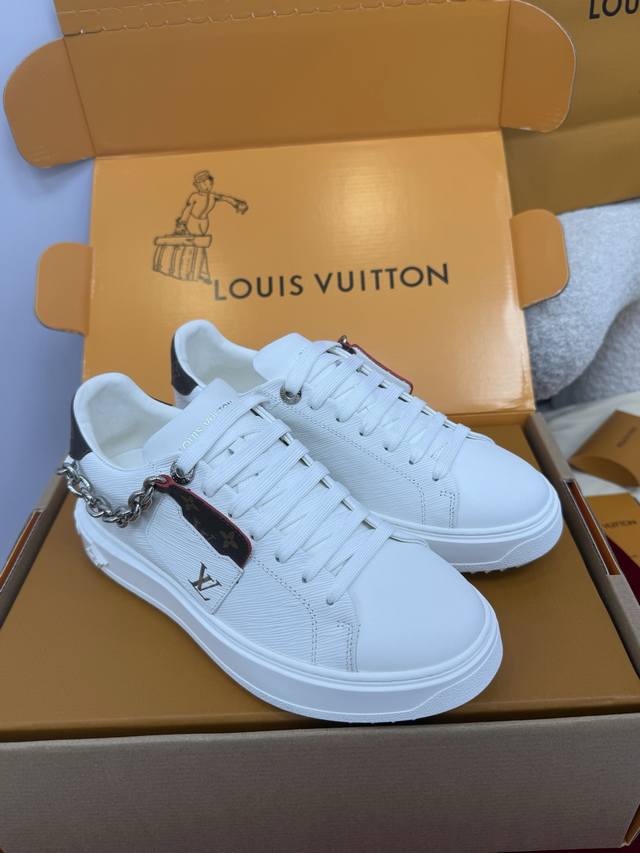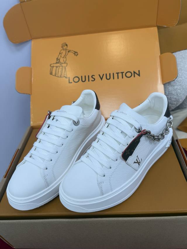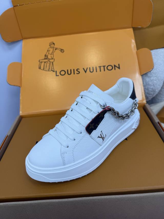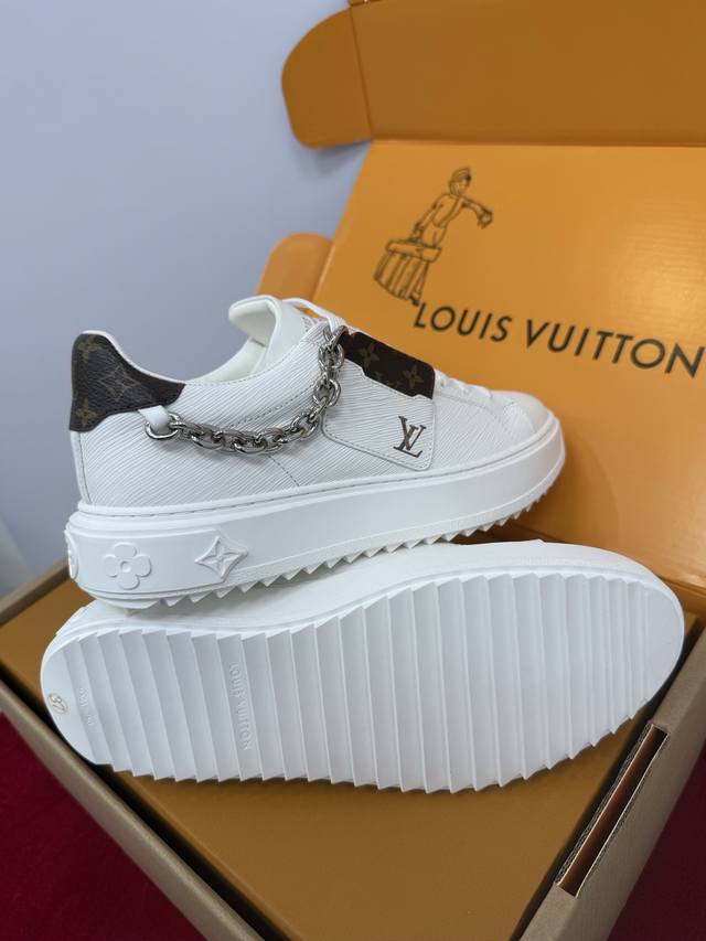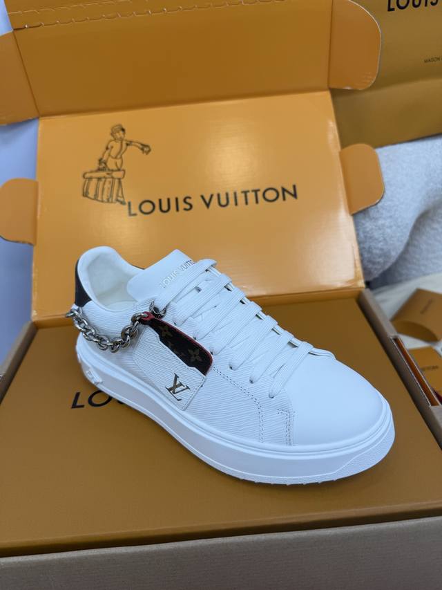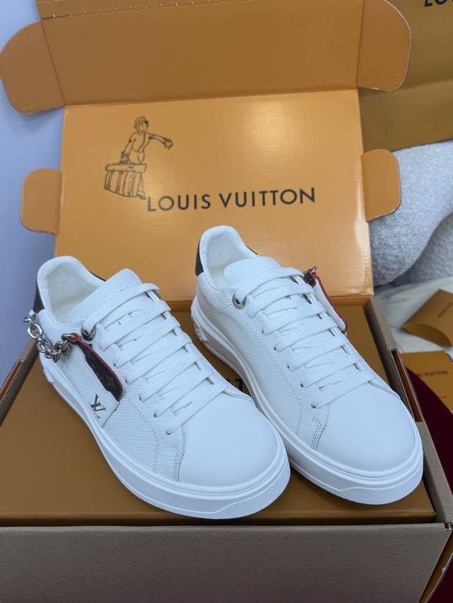 本款Time Out运动鞋取材柔软牛皮革以耀眼光泽点亮侧面Lv标识。铭纹孔眼和尾部质感皮革饰边丰富细节,加厚橡胶外底绽放Monogram花卉