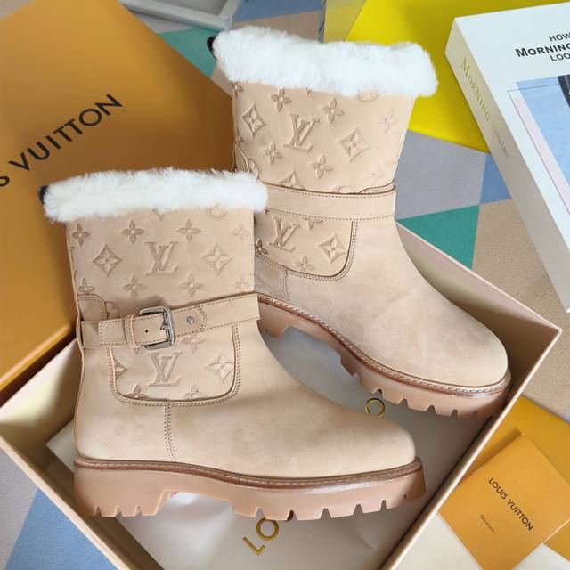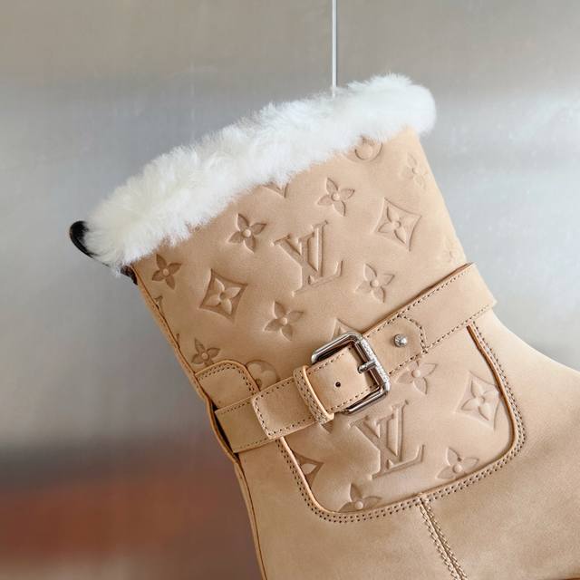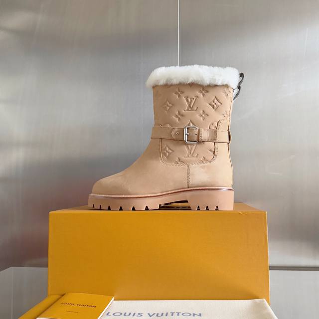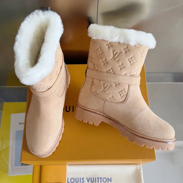 顶级版本:女款 DDD Lv 路易威登 L家 驴牌 Monogram系列 皮毛一体 厚底 雪地靴 DDD Monogram毛毛雪地靴,磨砂牛皮+经典老花压印,质感细腻又高级艹。内里羊皮毛一体,柔软保暖,秋冬穿超舒服!厚底设计有增高效果,西部牛仔风+金属扣带,实用又时髦 DDD 配送专柜精美包装 DDD 面料 : 原版定制进口头层牛皮 DDD 内里 : 进口保暖羊毛里 DDD 鞋底 : 原版开模防滑橡胶材质 DDD 底厚 :3.5Cm DDD Size : 女款35-41 40.41定 DDD