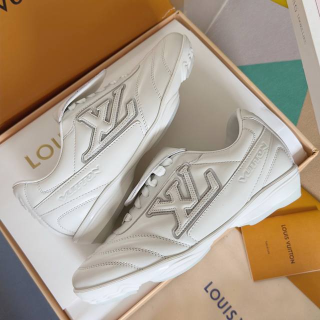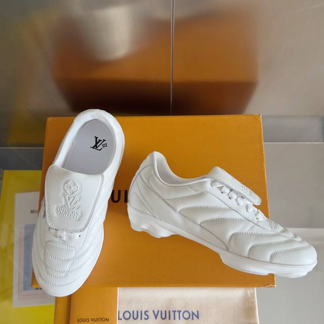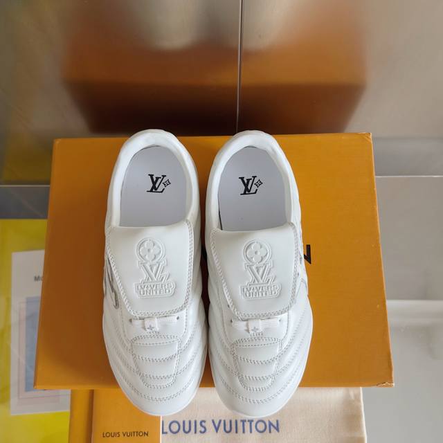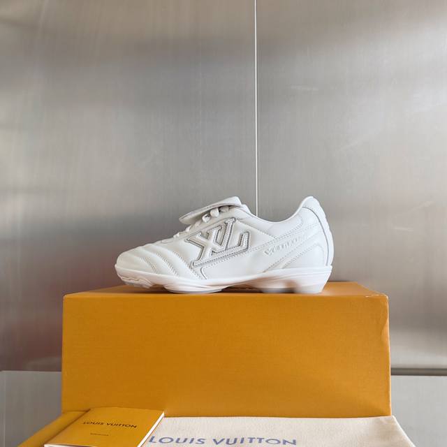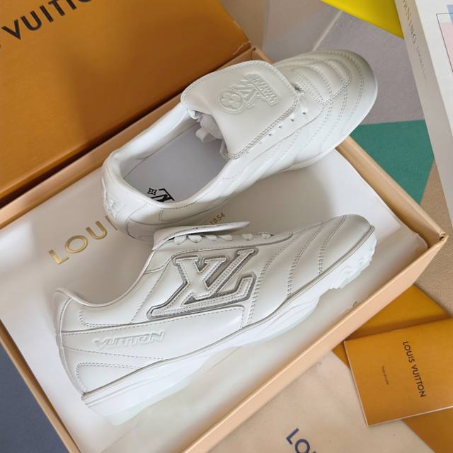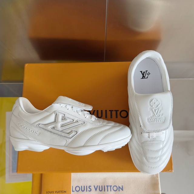 顶级版本:情侣款 DDD Lv路易威登L家 驴牌 最新Footprint系列 情侣款 足球运动鞋 休闲 跑鞋 DDD 原版购入开发 做货 这款 Footprint Soccer 运动鞋于2025春夏系列时装展中亮相,是pharrell Williams 首次以足球鞋为灵感设计的运动鞋。鞋款的灵感来自跨越世代和文化的足球运动,呼应2025春夏系列时装展团结一致、全民参与的主题。鞋款以流丽的设计著称,侧面以富动感的Iv Initials标志点缀,鞋舌缀有灵感来自足球队伍的Lvers United徽章,而脚掌纹