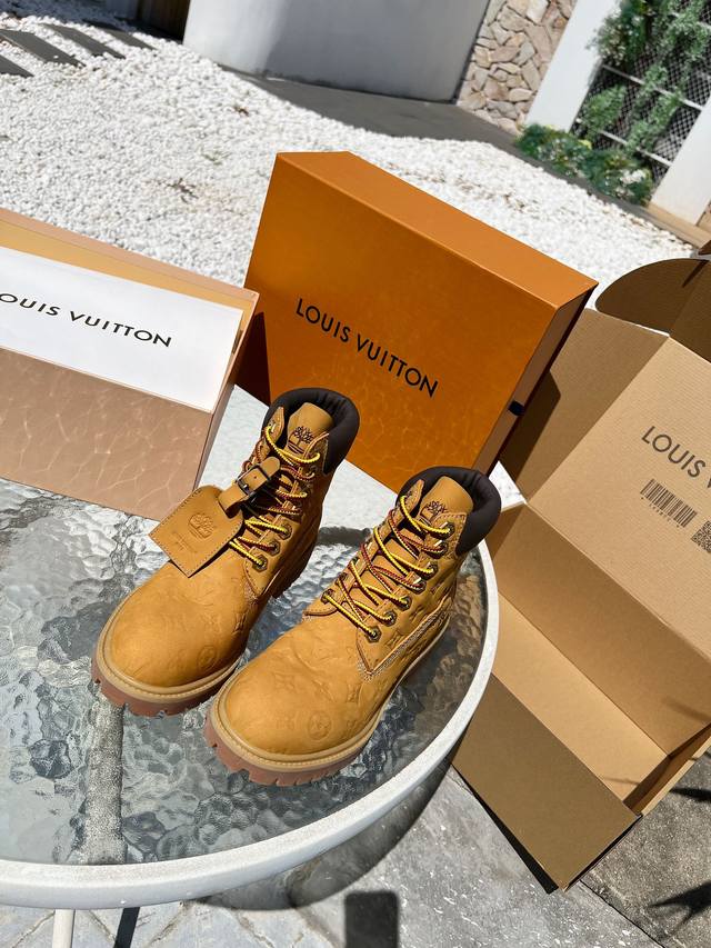FFF 顶级版本:情侣款Lv X Timberland 添柏岚 联名款 老花 压花 大黄靴 及踝靴 短靴 DDD Lv X Timberland 及踝靴取材 Monogram 压纹防水正绒面牛皮革,依托品牌精湛匠艺于意大利悉心重塑经典 Timberland 6 英寸靴型,以美式工装格调瞩目亮相 Pharrell Williams 打造的 秋冬男装秀。Monogram 压纹鞋舌、Timberland 原版鞋带和外底点睛考究细节,皮革标签抒写合作标识 DDD 配送专柜精美包装 DDD 面料: 原版定制进口头层