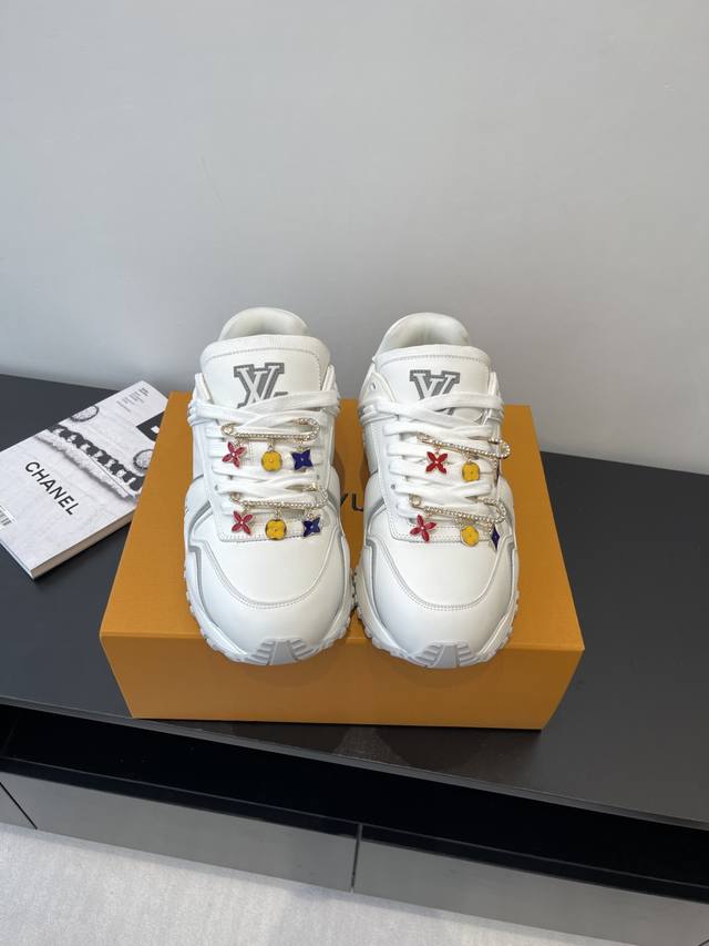 光滑牛皮革鞋面融入撞色L 字母和 Vuitton标识 轻盈橡胶坡跟外底援引跑鞋构型