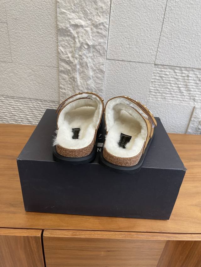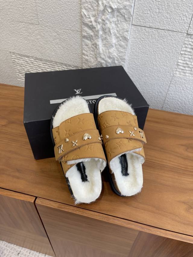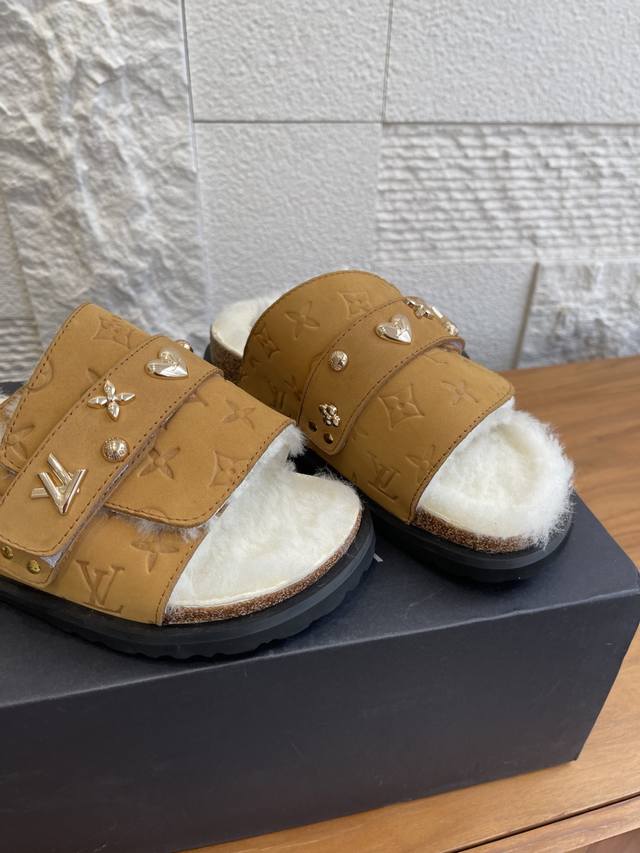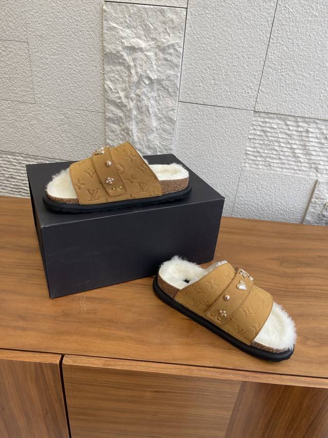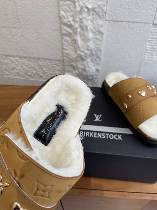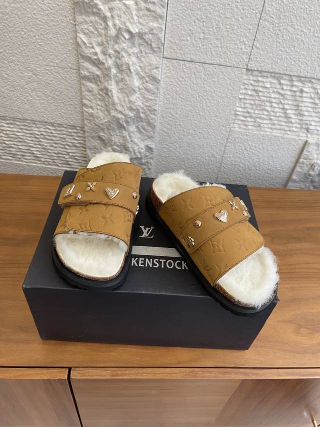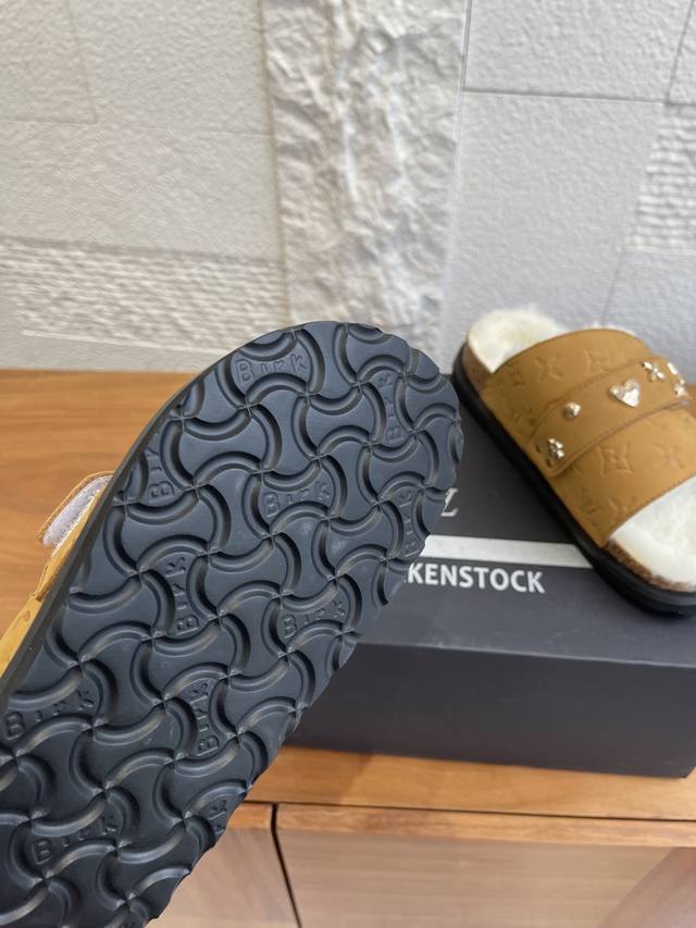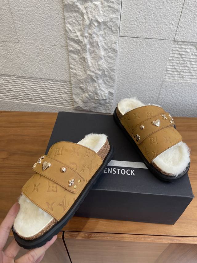 顶级版本: DDD Birkenstock 联名 Lv路易威登款 男女同款 软底 毛拖鞋 DDD Birkenstock Lv路易威登 联名款 采用品牌标志性的压纹老花皮革,鞋型为经典包头拖,搭配搭扣设计,色彩有米白、浅灰、黑色,兼具辨识度与百搭性。老花元素强化品牌辨识度,简约鞋型适配多种休闲或轻商务场景。 DDD 面料: 麂皮绒 DDD 内里: 毛绒 DDD 大底: 原版开模软木底 橡胶发泡底片 DDD Size: 女# 35-40 40定做不退换 DDD 男# 39-45 45定做不退换 DDD