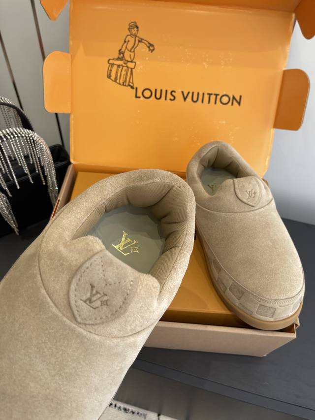 Louis Vuitton 2025 秋冬新款时尚魔术贴拉链包羊羔毛女拖鞋 Lv字母Logo平底圆头拼色露趾居家鞋 鞋面:进口100%羊羔毛...