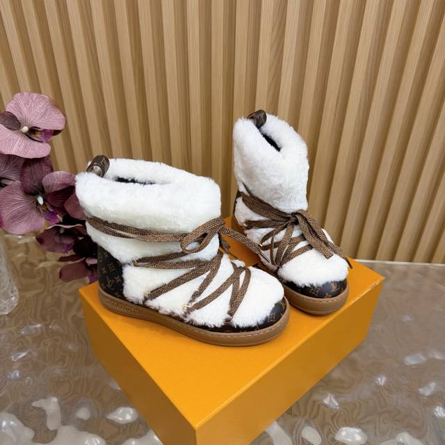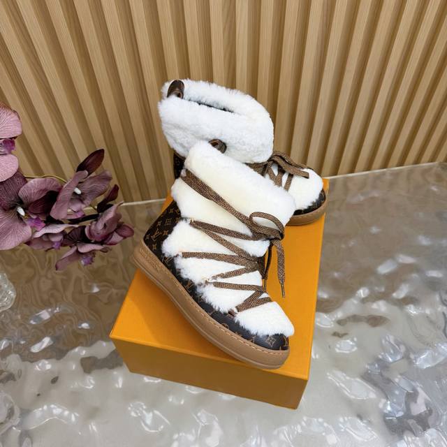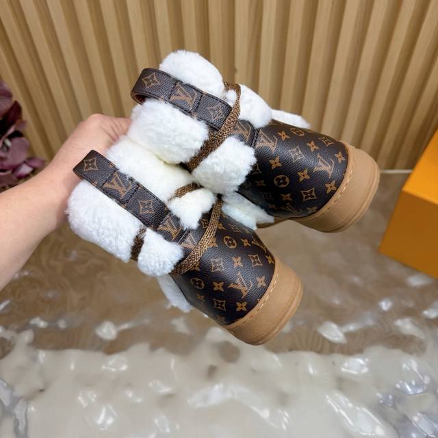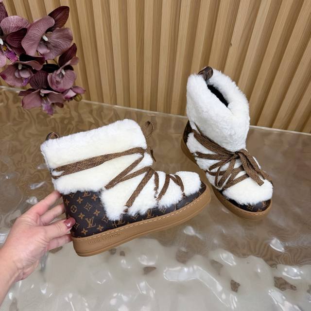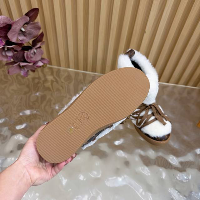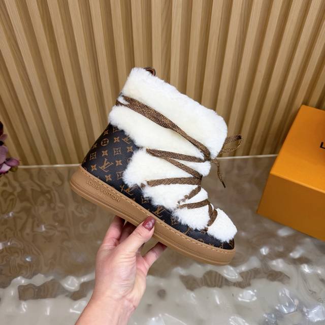 顶级版本 Lv 2025秋冬新款羊毛绑带雪地靴 日常Ootd就没有它搭配不了的 鞋头压花Logo点缀尽显精致感 鞋型真的值得我推一万年 非常修饰脚型 看着呆萌但
