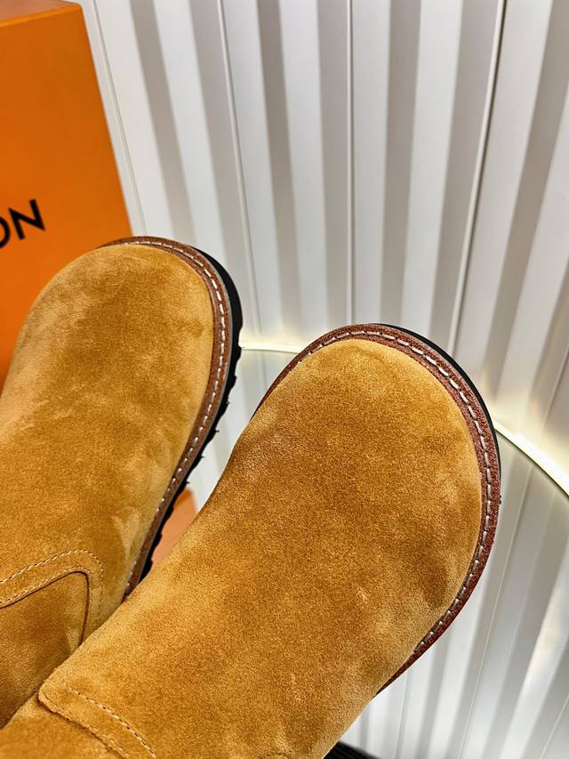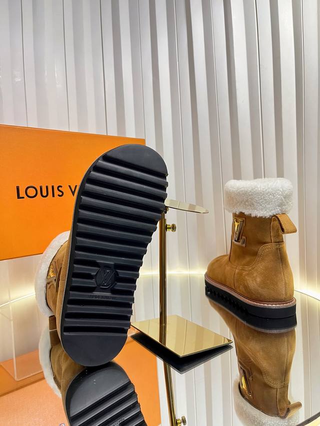 顶级版本Lv秋冬新品羊毛短靴,进口皮毛一体羔羊毛,原版五金拼皮大Logo,超美! 鞋面材质是比较厚实的丝光牛反绒 老花,内里羊羔毛,真皮沿条,鞋底原版定制A级胶