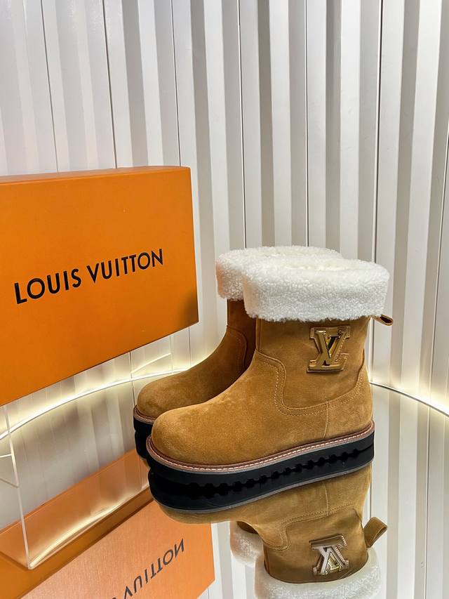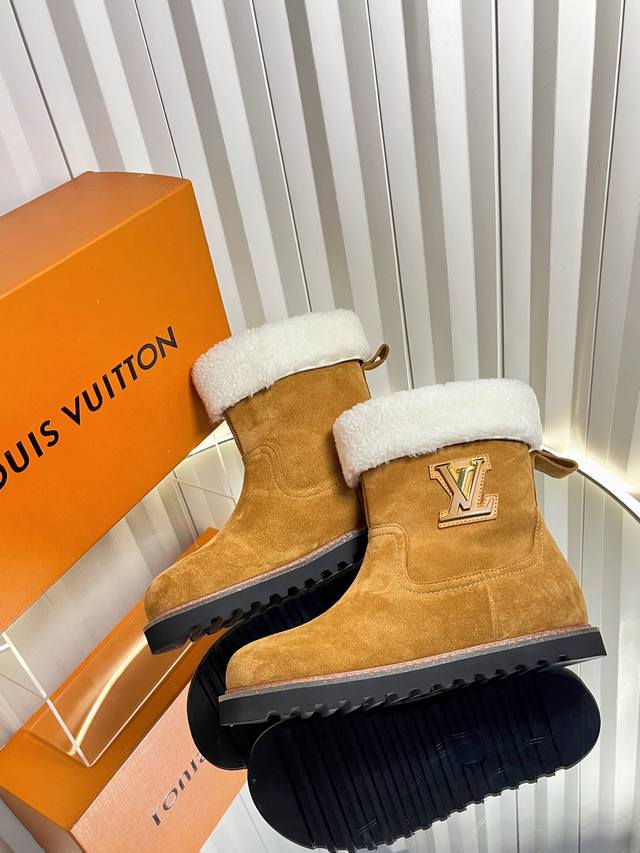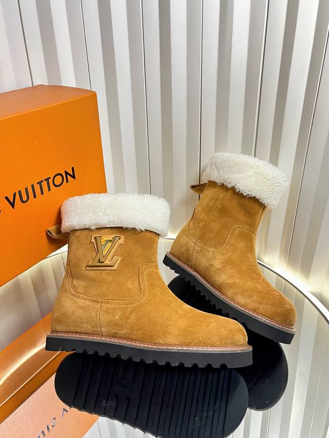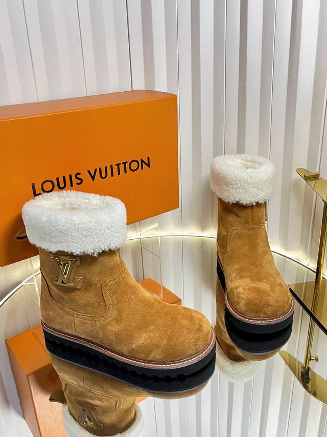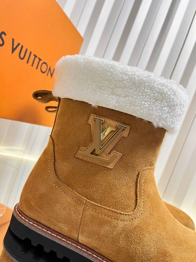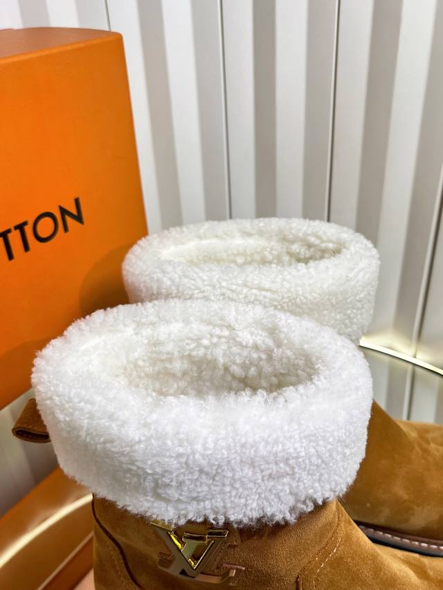 / 顶级版本Lv秋冬新品羊毛短靴,进口皮毛一体羔羊毛,原版五金拼皮大Logo,超美! 鞋面材质是比较厚实的丝光牛反绒 老花,内里羊羔毛,真皮沿条,鞋底原版定制A级胶